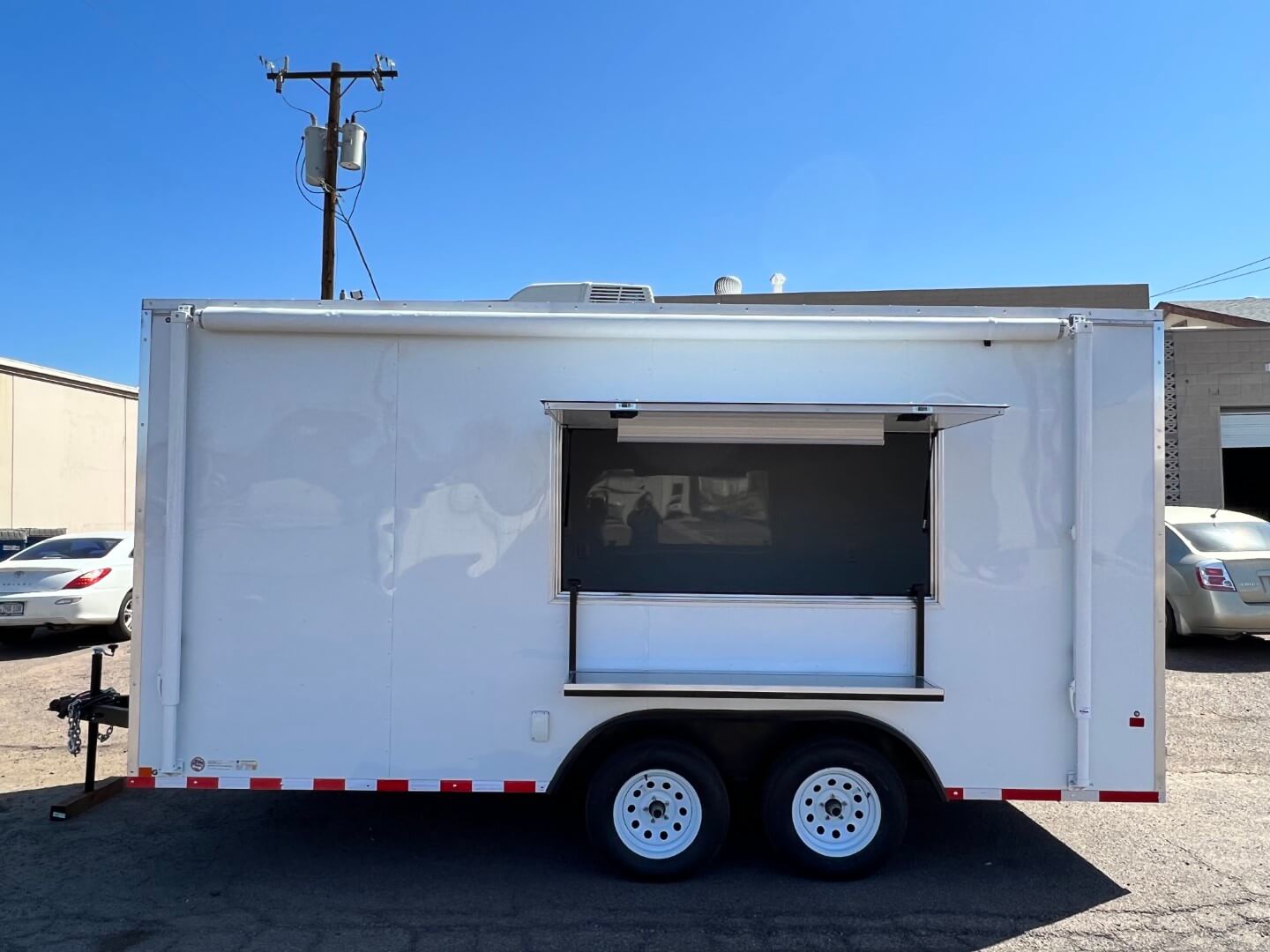 Don’t be fooled by its simple exterior. This trailer was designed with efficiency and comfort in mind. Ideal for special events and rural areas, it’s a versatile solution that can adapt to your needs. An Onan generator powers the single AC unit, maintaining a cool and comfortable interior even on hot summer days. The generator is conveniently mounted on a slide-out on the curbside front corner of the entry door. On the street side, an access window with an awning provides shade, creating a pleasant environment for interactions with the operator inside the trailer. A counter also folds down outside the trailer, offering customers an external workspace.