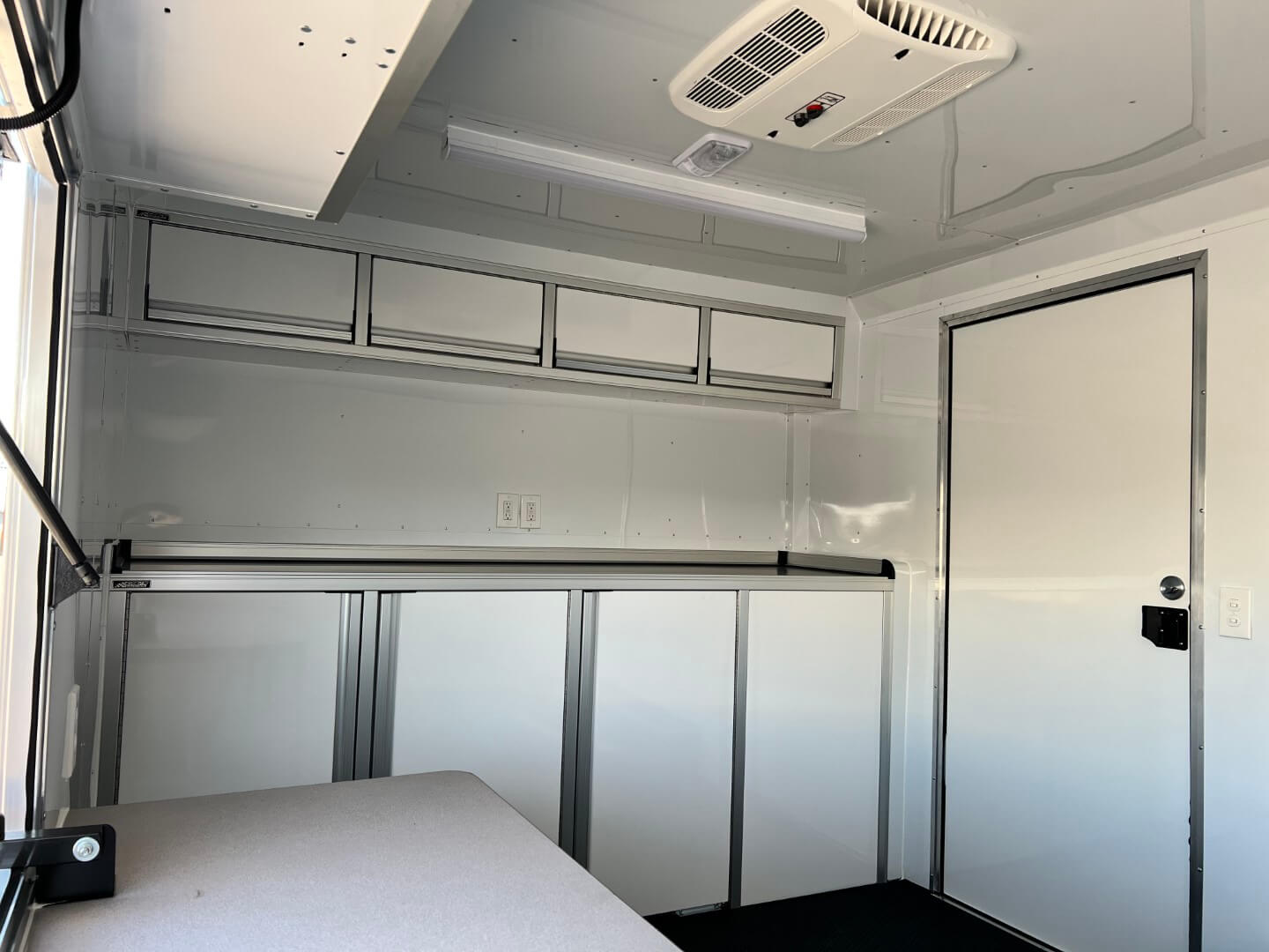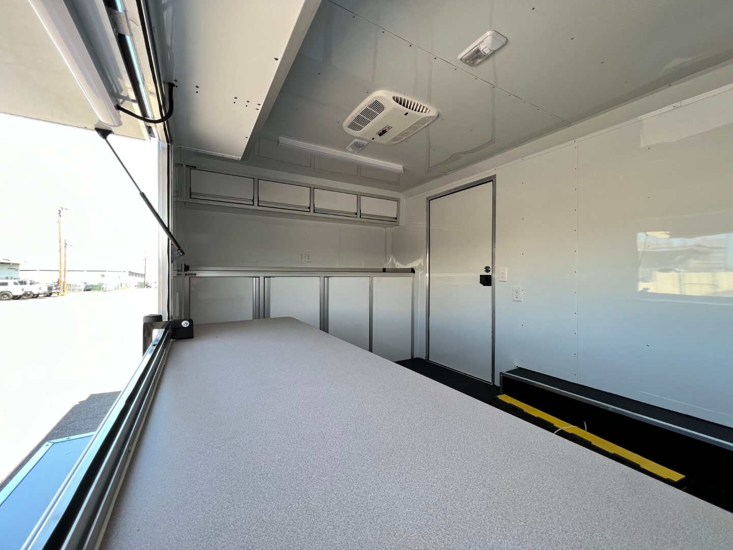 Inside the trailer and you’ll be greeted by a C-Tech base cabinet along the front wall, accompanied by a matching C-Tech cabinet overhead. This thoughtful design provides ample storage space, ensuring that all equipment is neatly organized. Two outlets above this counter are ready to power any additional equipment you might need. On the street side, a counter for the operator to work at, with more C-Tech cabinets above, further enhances the practicality of this trailer.