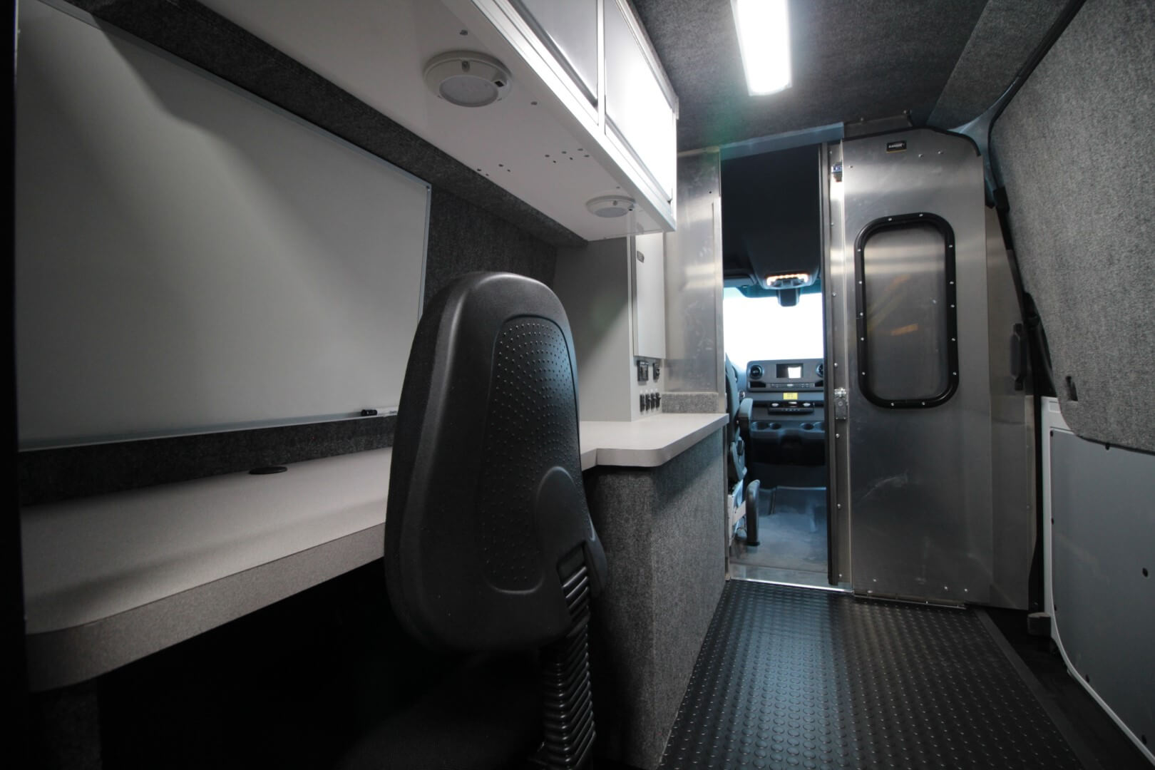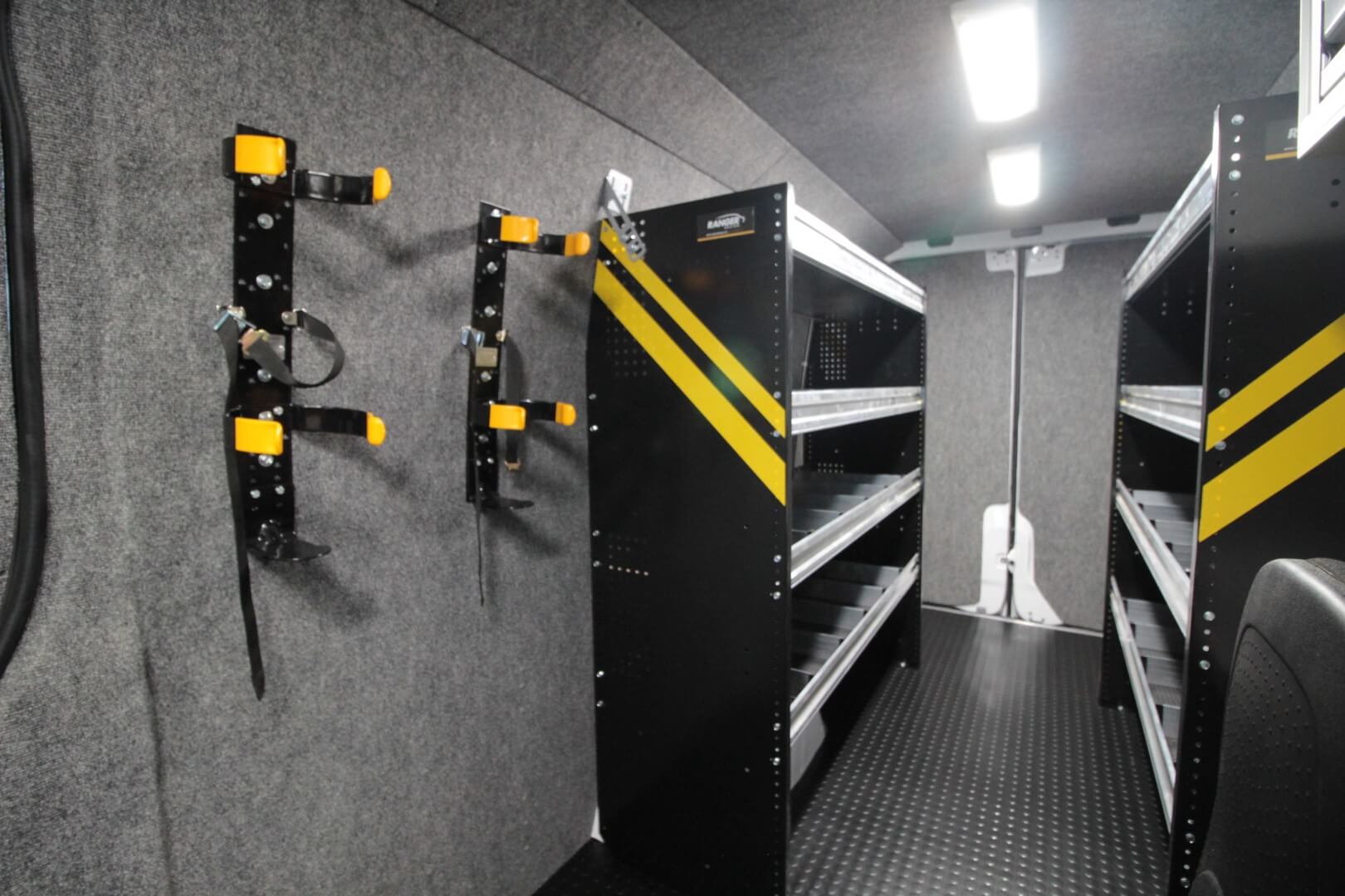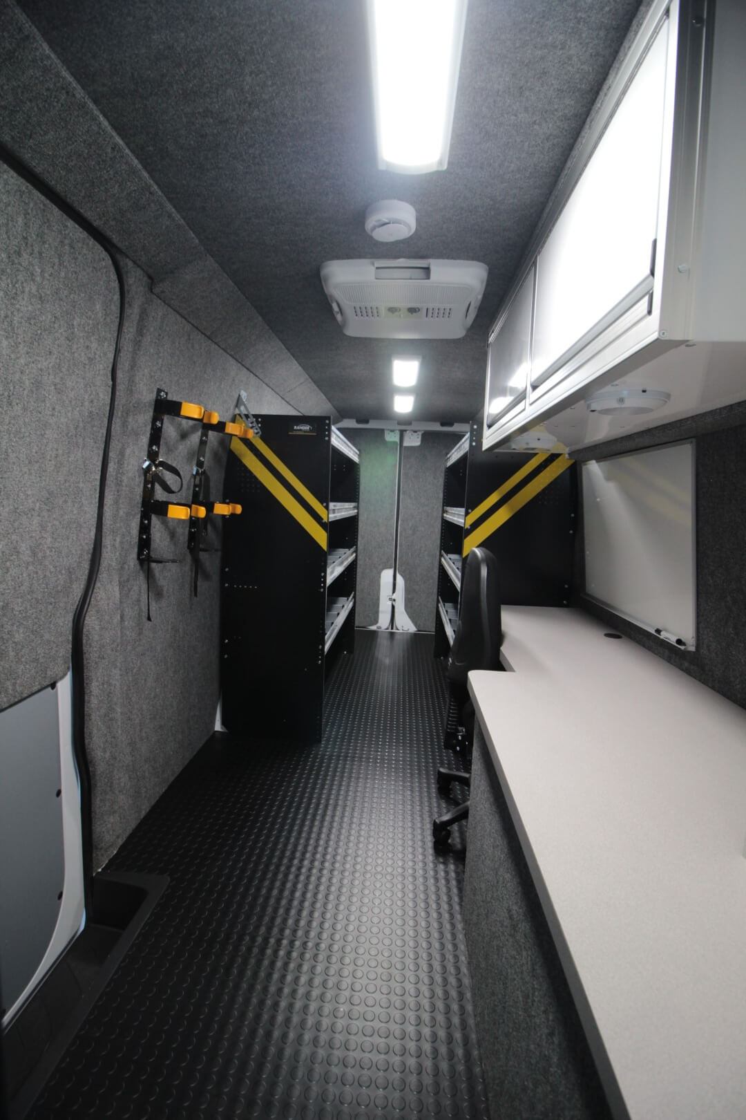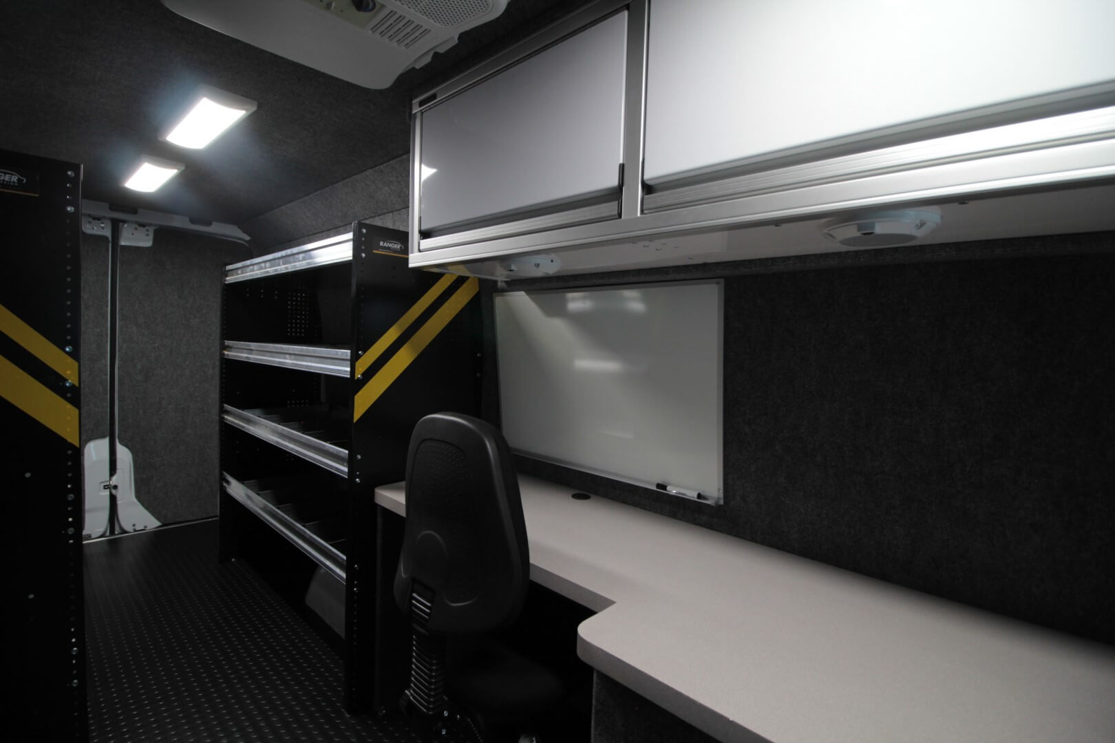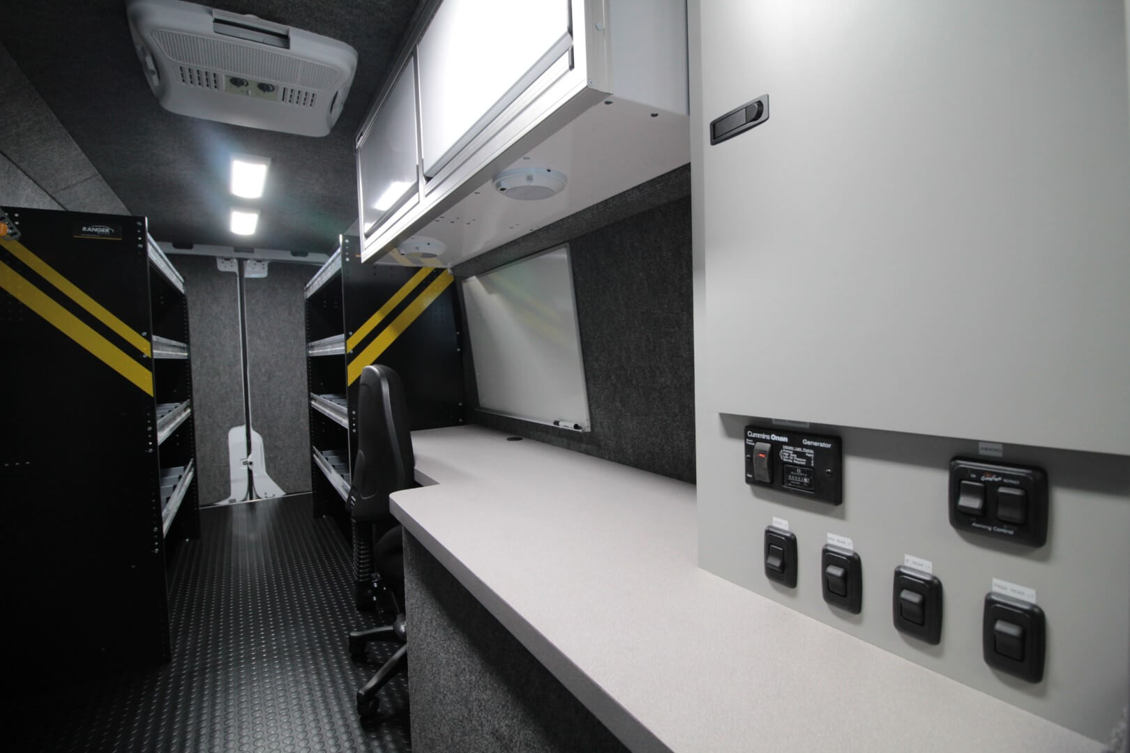 This Hazmat response van comes fully equipped with two Zyrtic SCBA backpacks and bottle holders. A Ranger bulkhead has also been installed behind the cab to ensure safety. Inside the van is a functional workstation above the generator, along with an overhead cabinet for easy access to essential equipment. Moving towards the van’s rear, you will find two Ranger aluminum shelves to neatly store additional items.