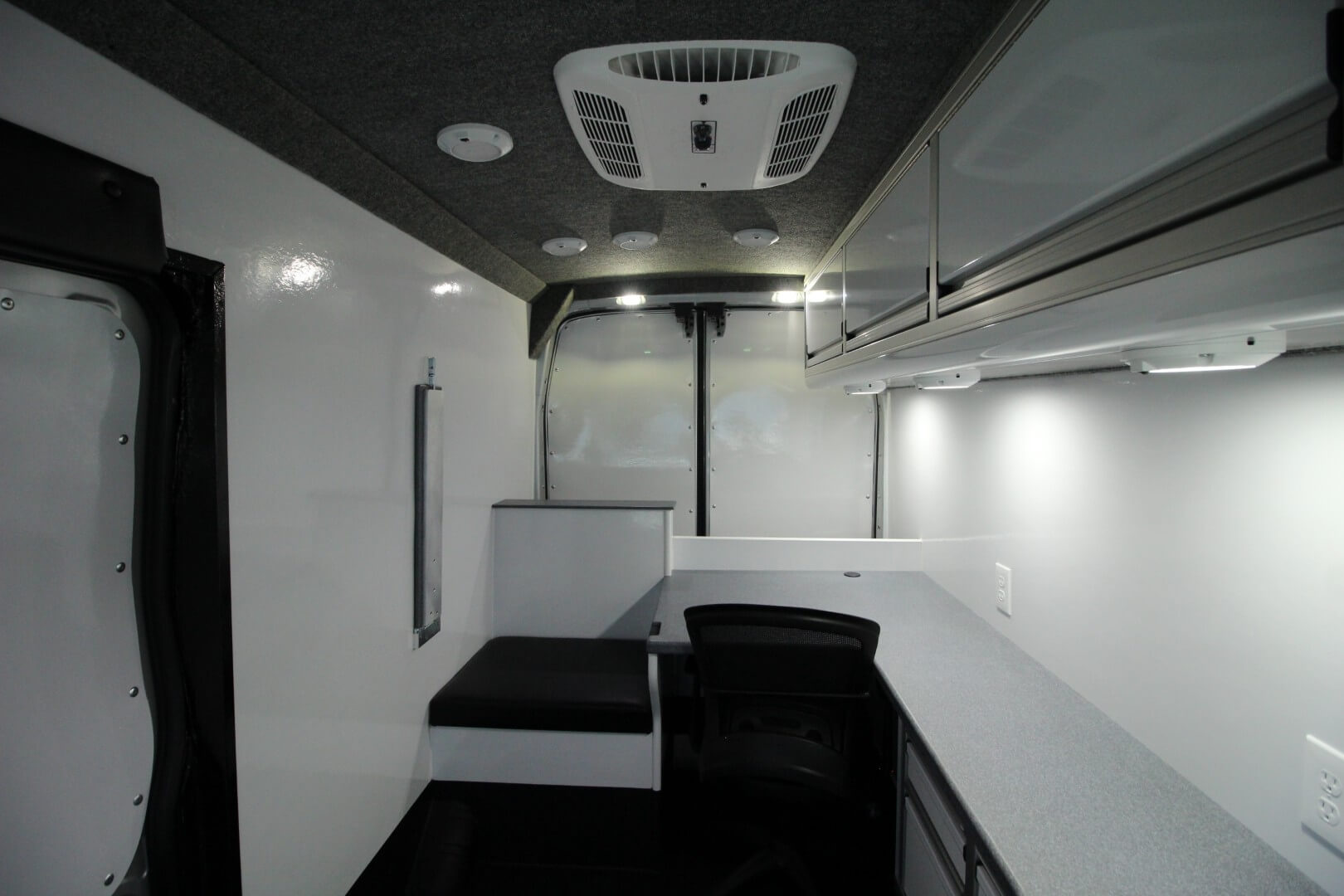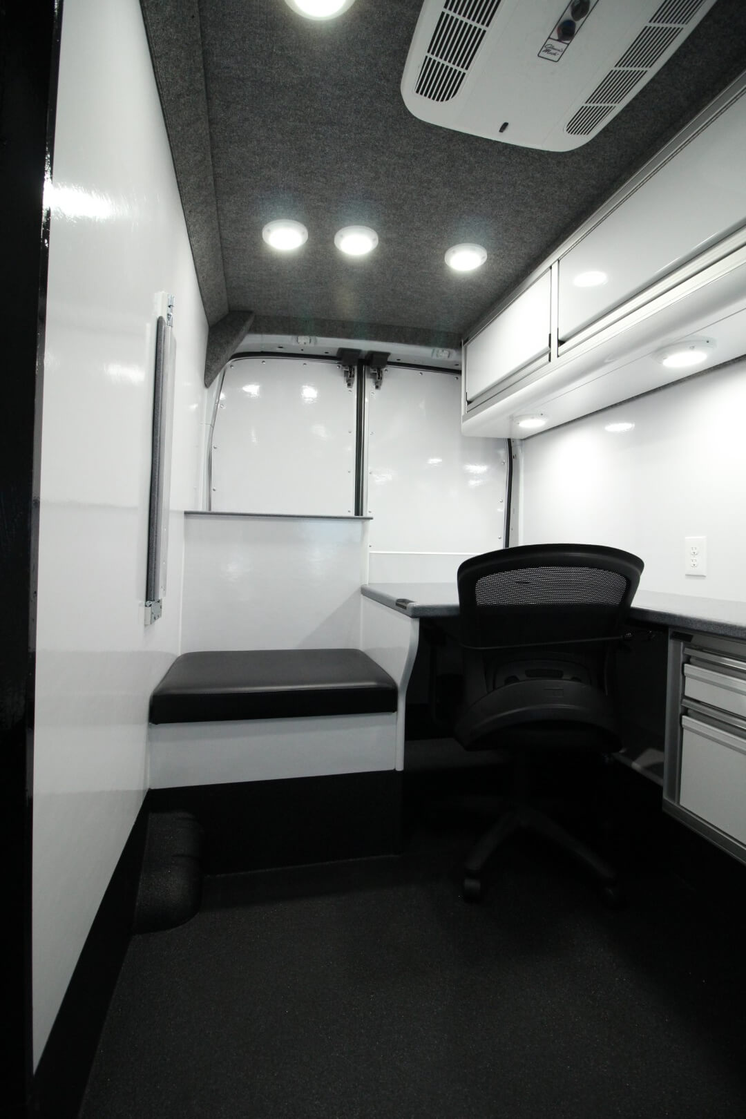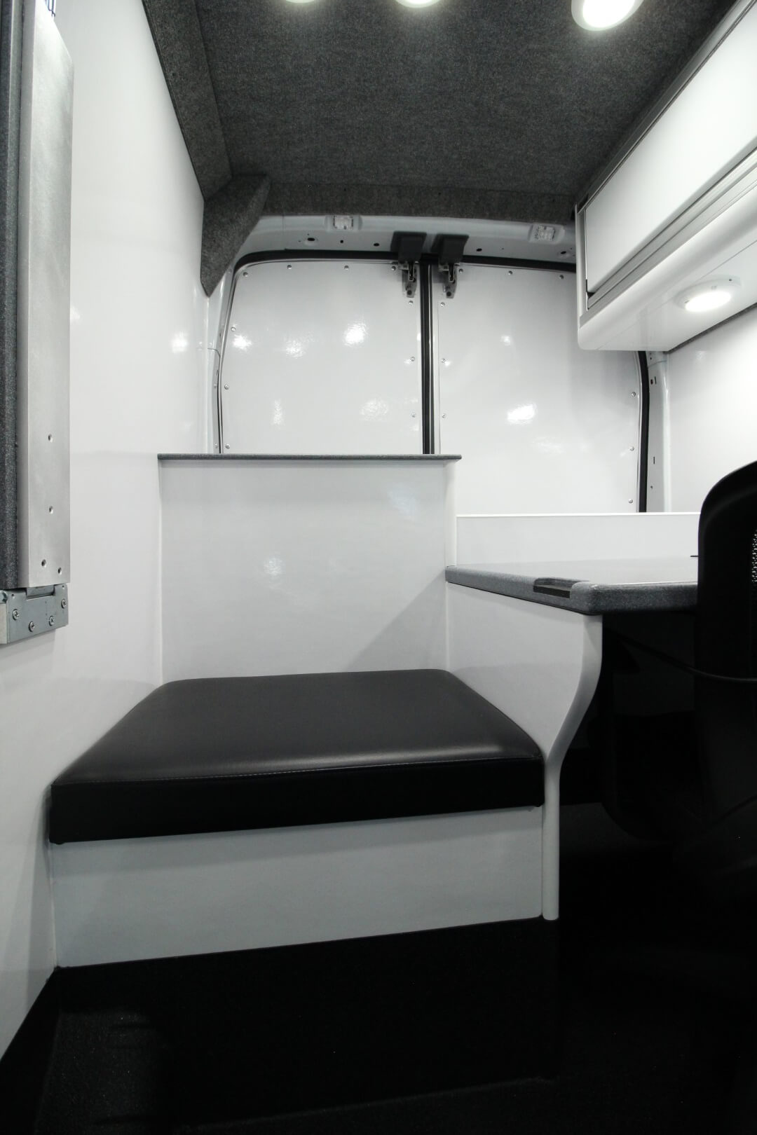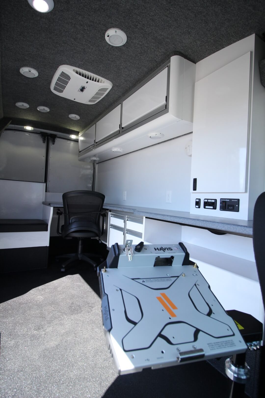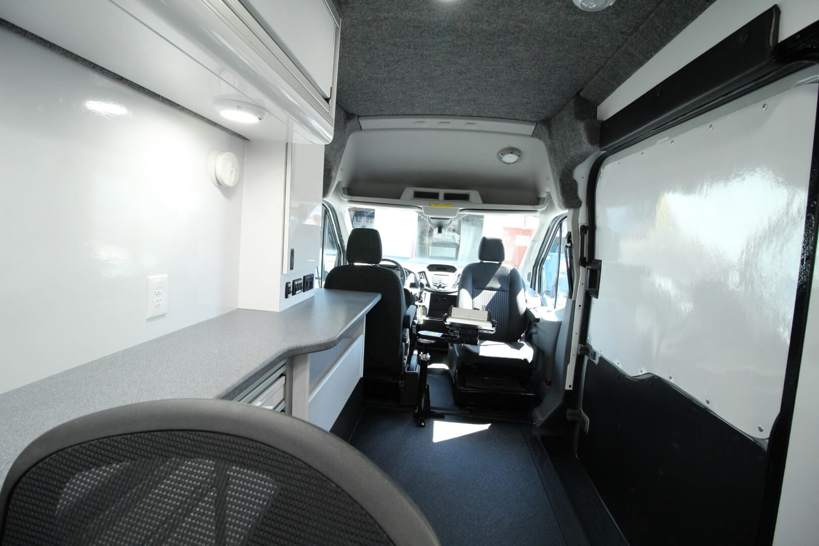 Inside the van we have created a seamless operational flow, adding customs features to help this department adapt the layout with their already in use processes. Many of these design choices blend together creating a cohesive workspace.