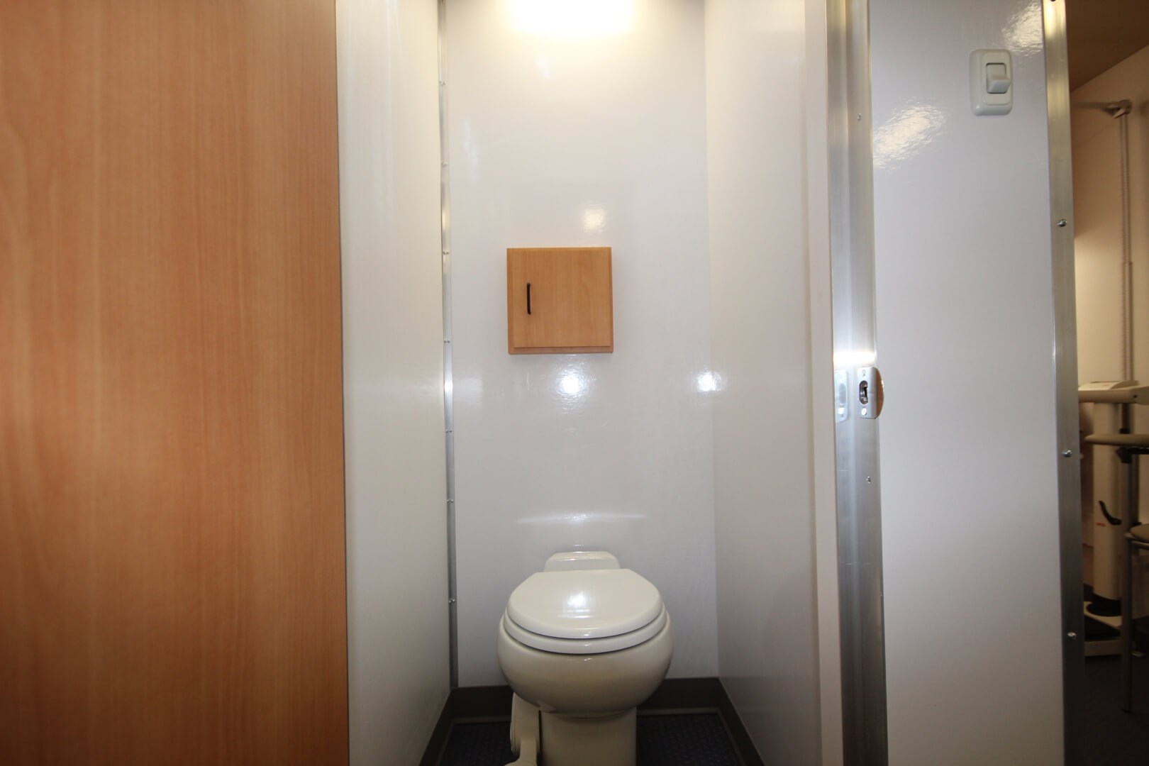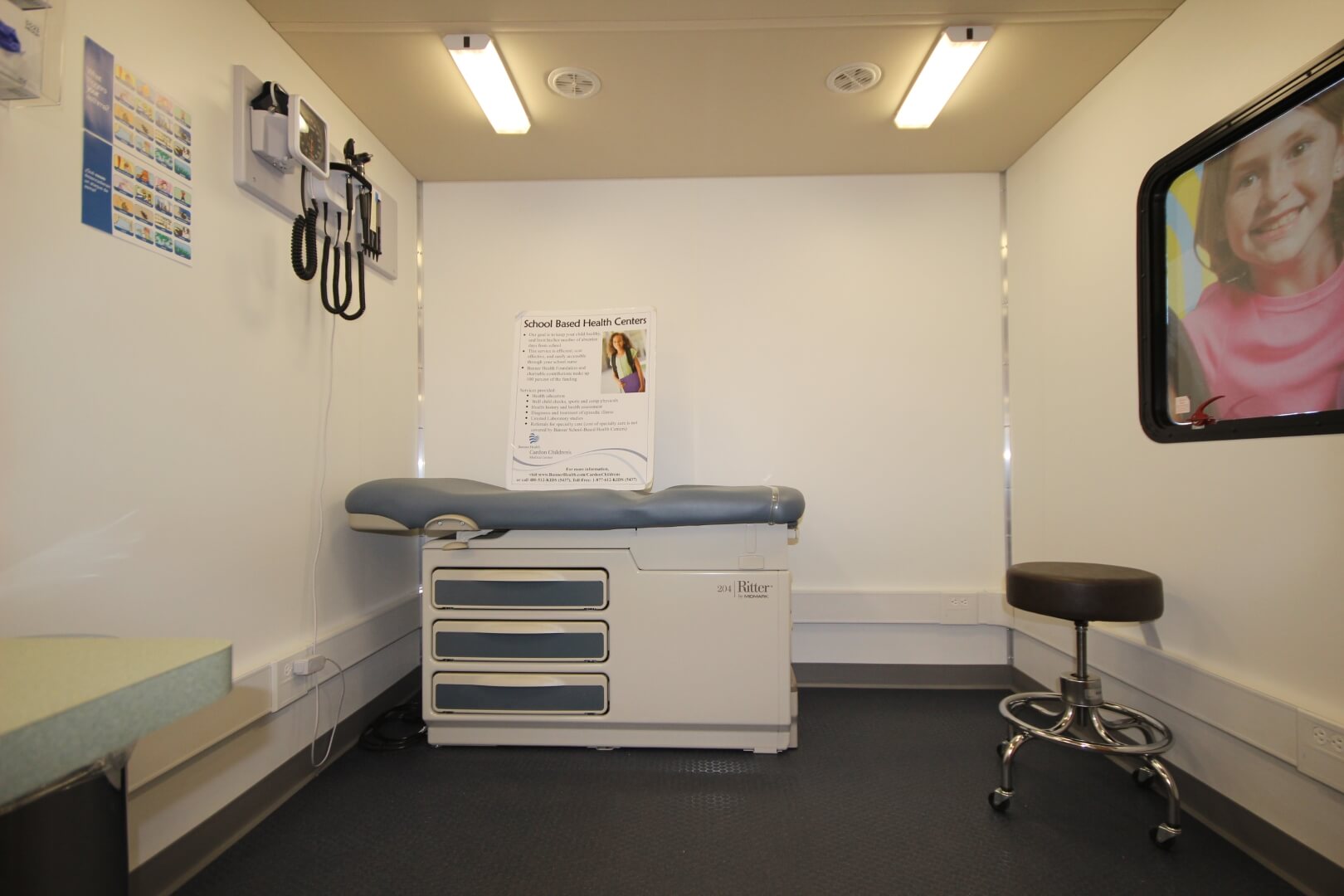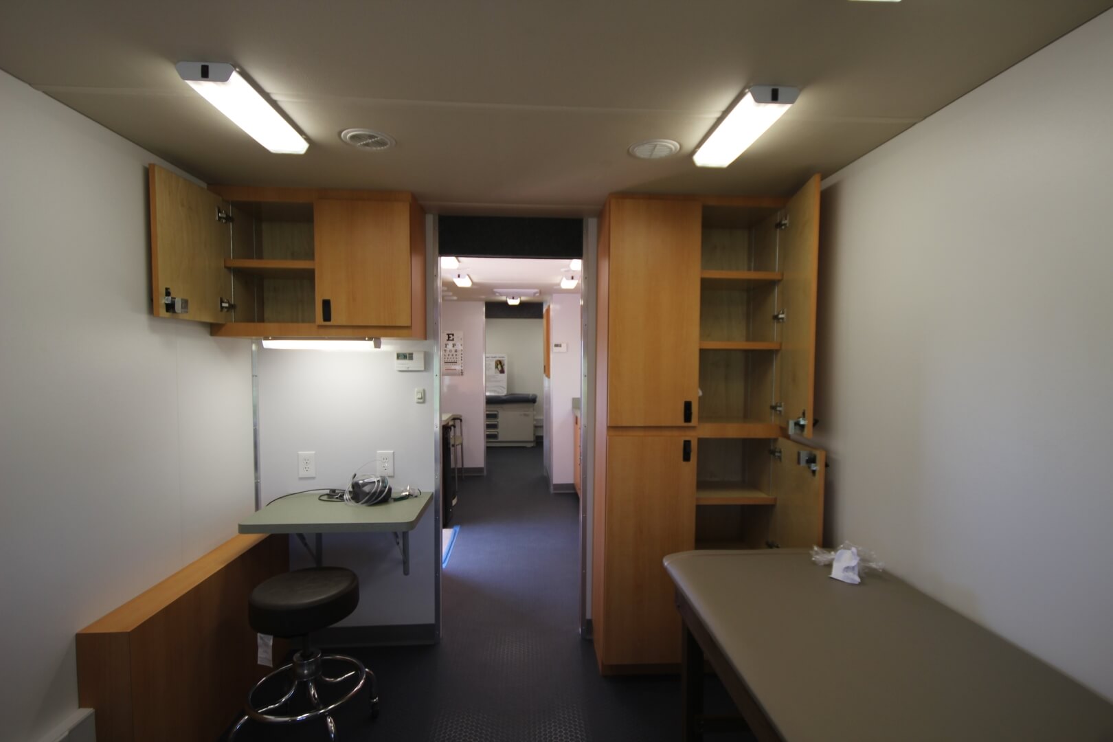 In the rear is the exam room, designed with efficiency in mind. This room has a Midmark Ritter examination table, a small workspace and overheads, and a diagnostic board on the wall. While the back room is simple, it’s designed to make exams swift and efficient in this mobile space. The bathroom is also accessible through this room.