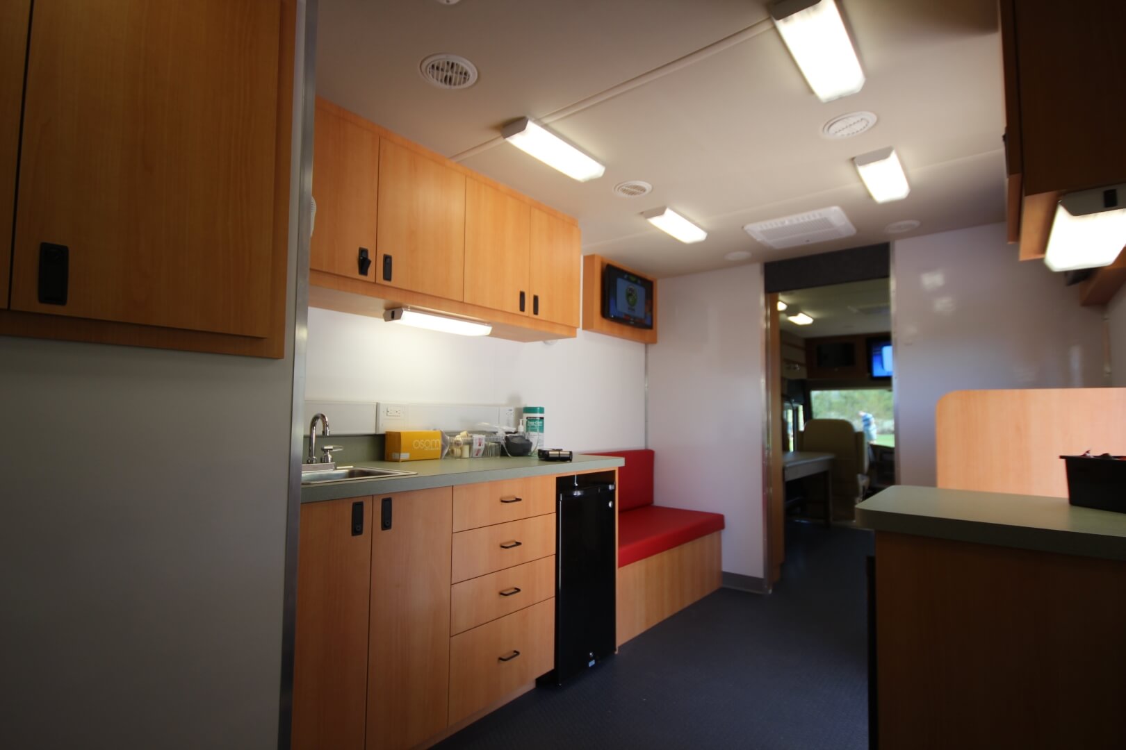Opposite the door on the driver’s side is a custom work area with a fridge underneath the counter. Above the counter is a line of cabinets for ample storage. A lab area next to the wall connecting to the bathroom, with a sink and pass-through cabinet accommodates specimens for analysis.