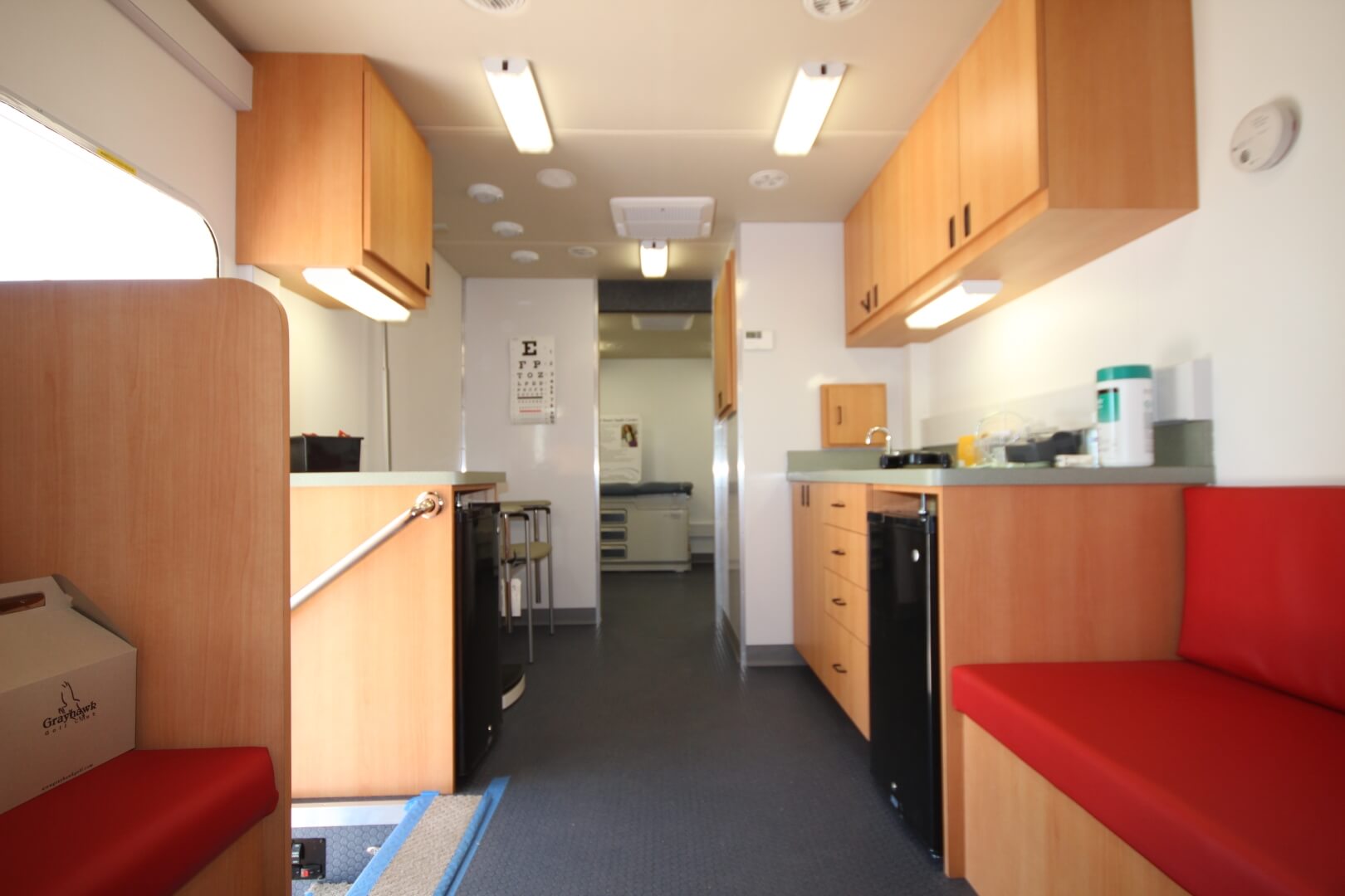 This mobile medical vehicle was meticulously designed for the utmost convenience. It provides patients and medical staff with a comfortable and efficient environment. It features an electric awning that offers ample shade, creating a welcoming outdoor space. Four A/C units were installed to help maintain a comfortable and relaxed environment. The vehicle has two well-appointed exam rooms, a bathroom, workspaces, a blood draw chair, and a waiting area with televisions to display educational programming or other material for patients.