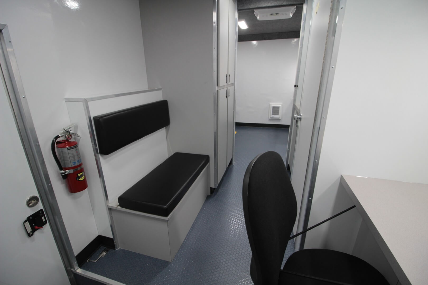 Upholding patient confidentiality and best practices, the front and rear exam room are separated by a pocket door. Inside this rear room we have fully upfitted an exam room, able to provide and in office level of comfort in a mobile package.