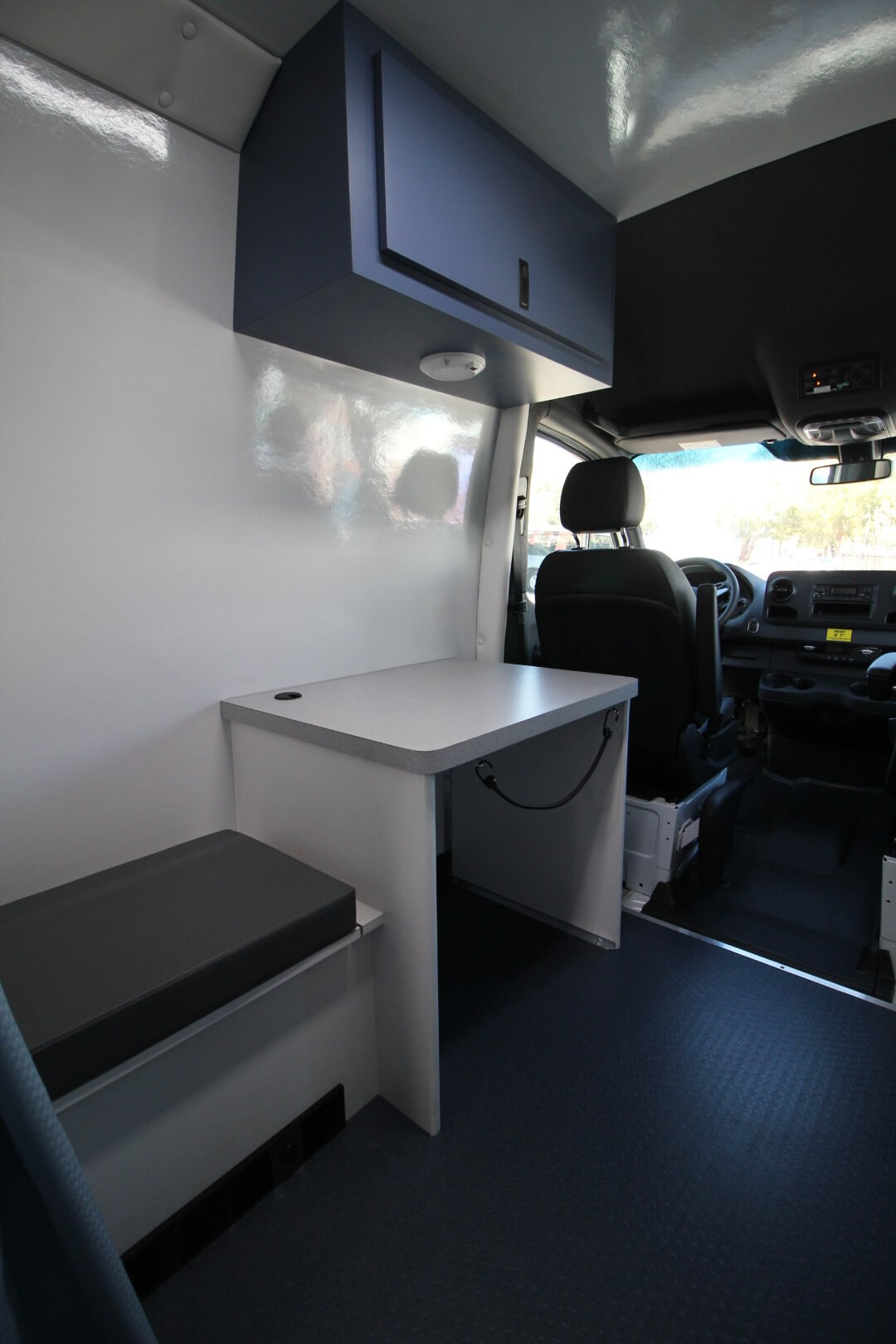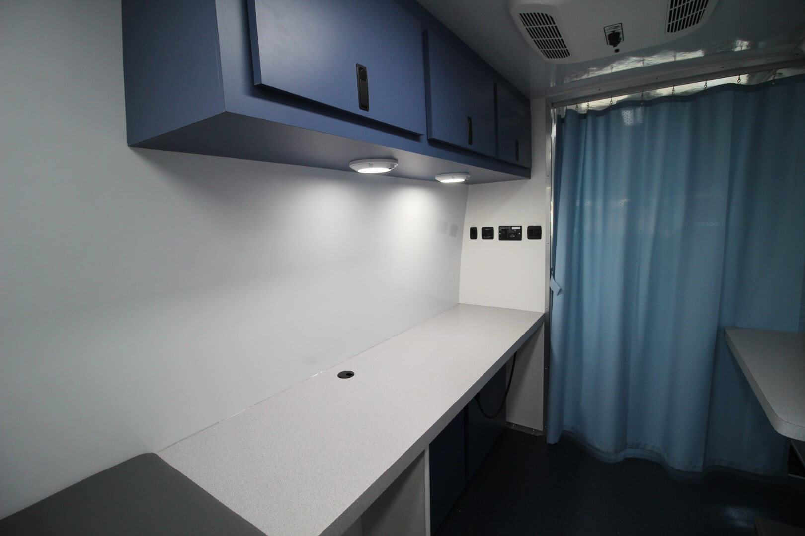 Inside, the van features a thoughtfully designed clinical layout. Splitting the vehicle into two dedicated work areas just after the slide door step well. In the smaller front intake area there is: