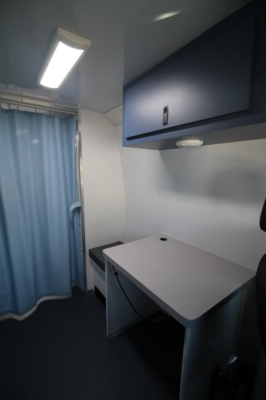 Along the driver side a nurse’s station includes a desk with overhead cabinet for storage
