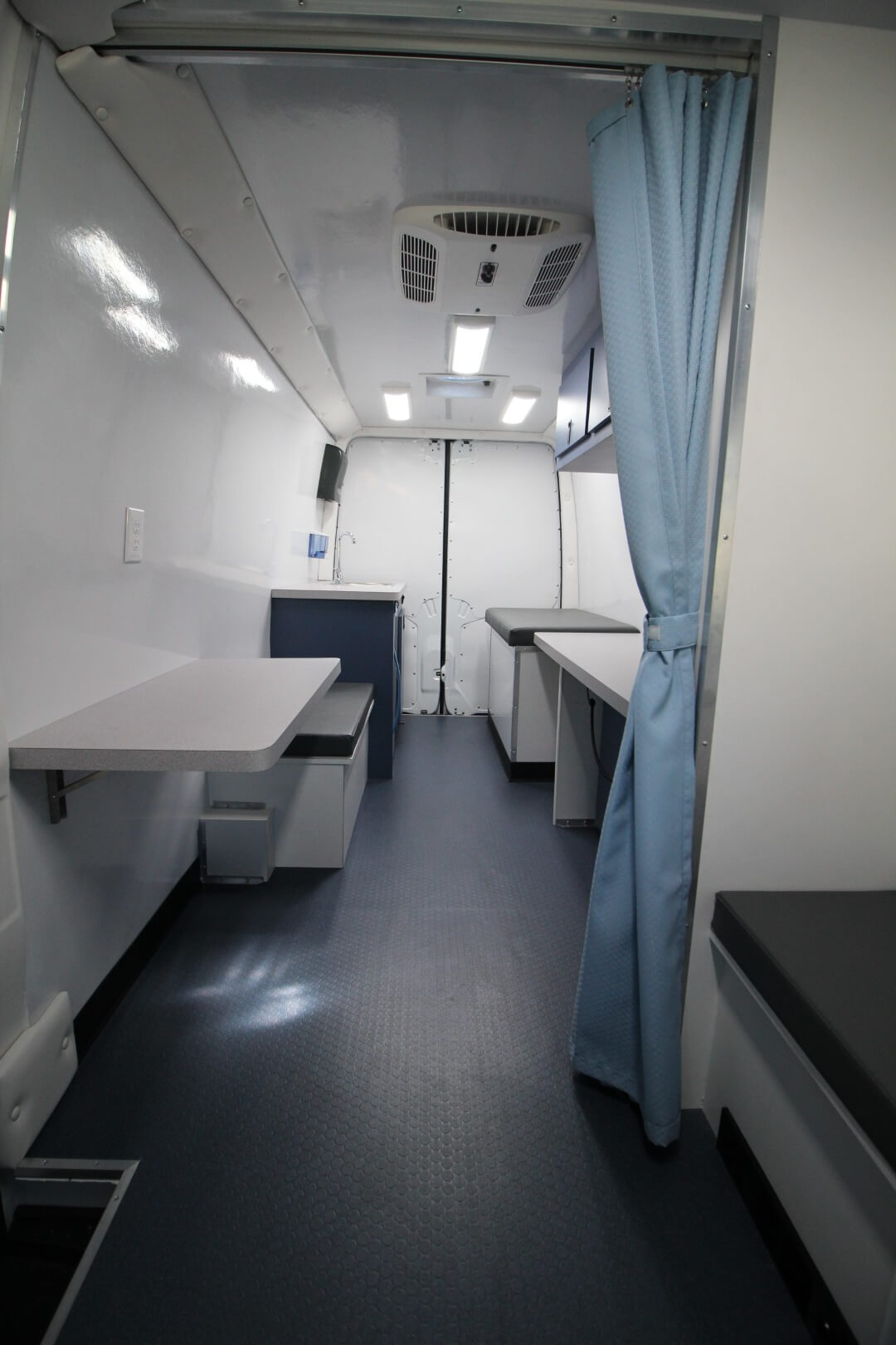 This creates an organized intake area separated by a privacy partition with curtain. Making this rear area the larger of the two areas it’s been outfitted with more features than the front area.