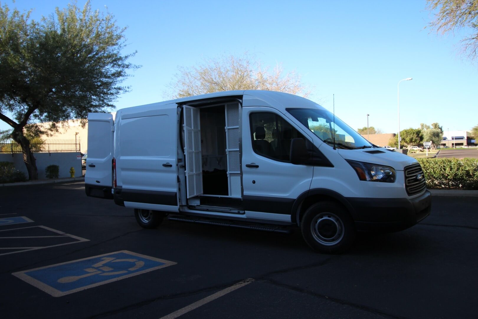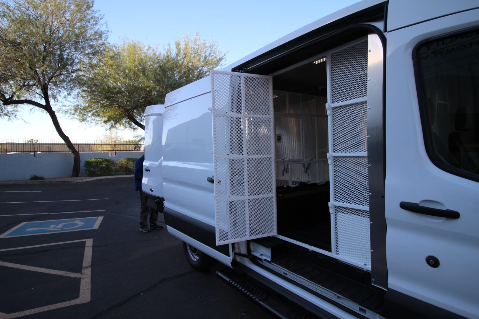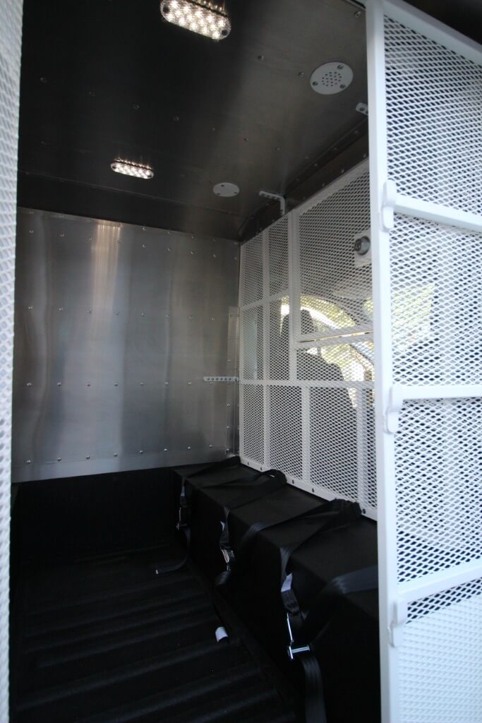 This ADA-friendly prisoner transport van features a fully customized cage system extending from wall to wall and floor to ceiling, eliminating unnecessary roof panels and maximizing airflow throughout the cabin. This design significantly improves cooling efficiency, reduces rattling, and enhances inmate safety—making it ideal for agencies transporting multiple prisoners or individuals with mobility needs.