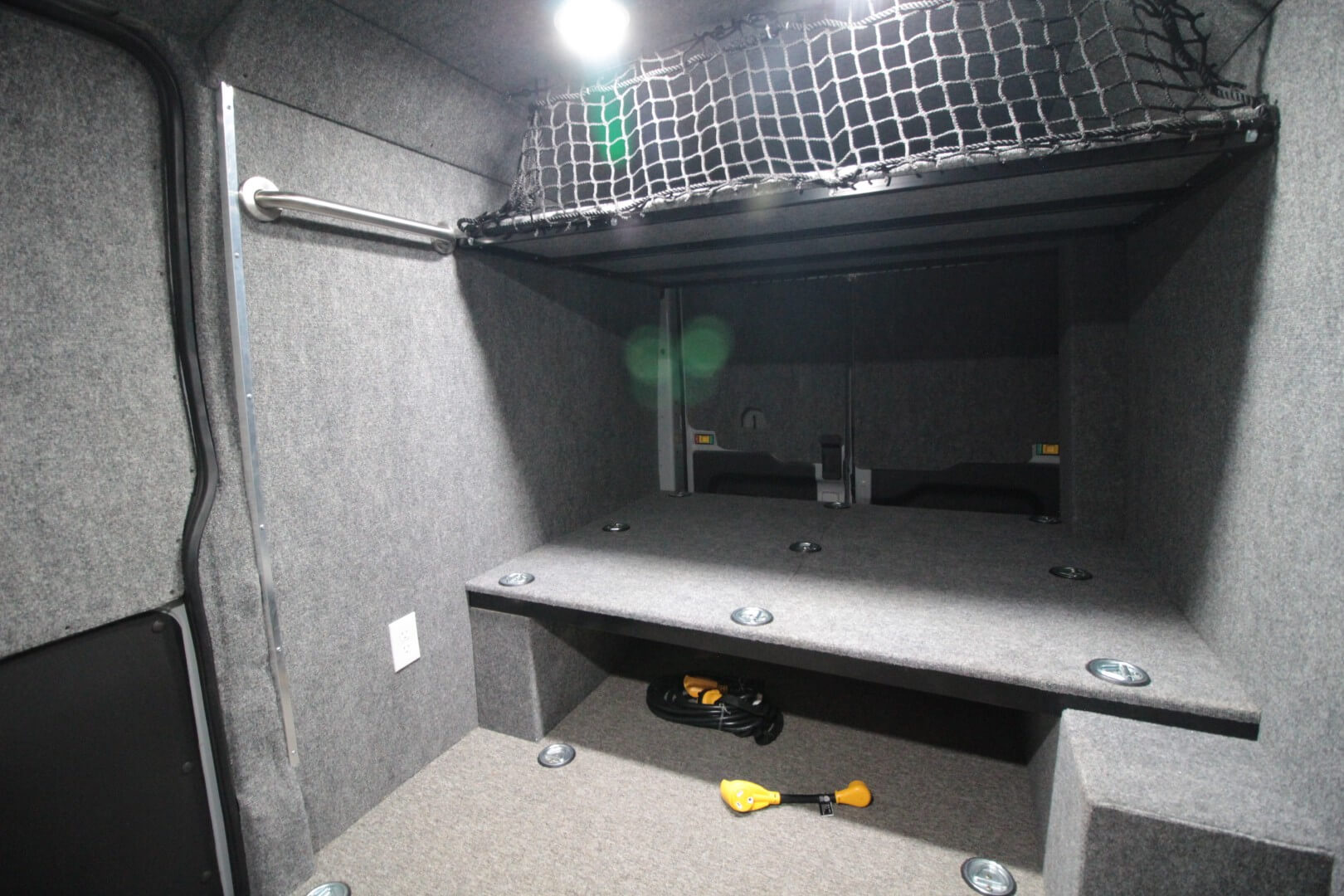 Secure Custom Kennel Bunk: Rear custom bunk accommodates two specially designed kennels, perfect for multi-dog transport
