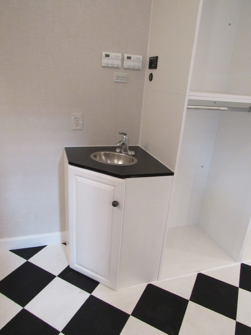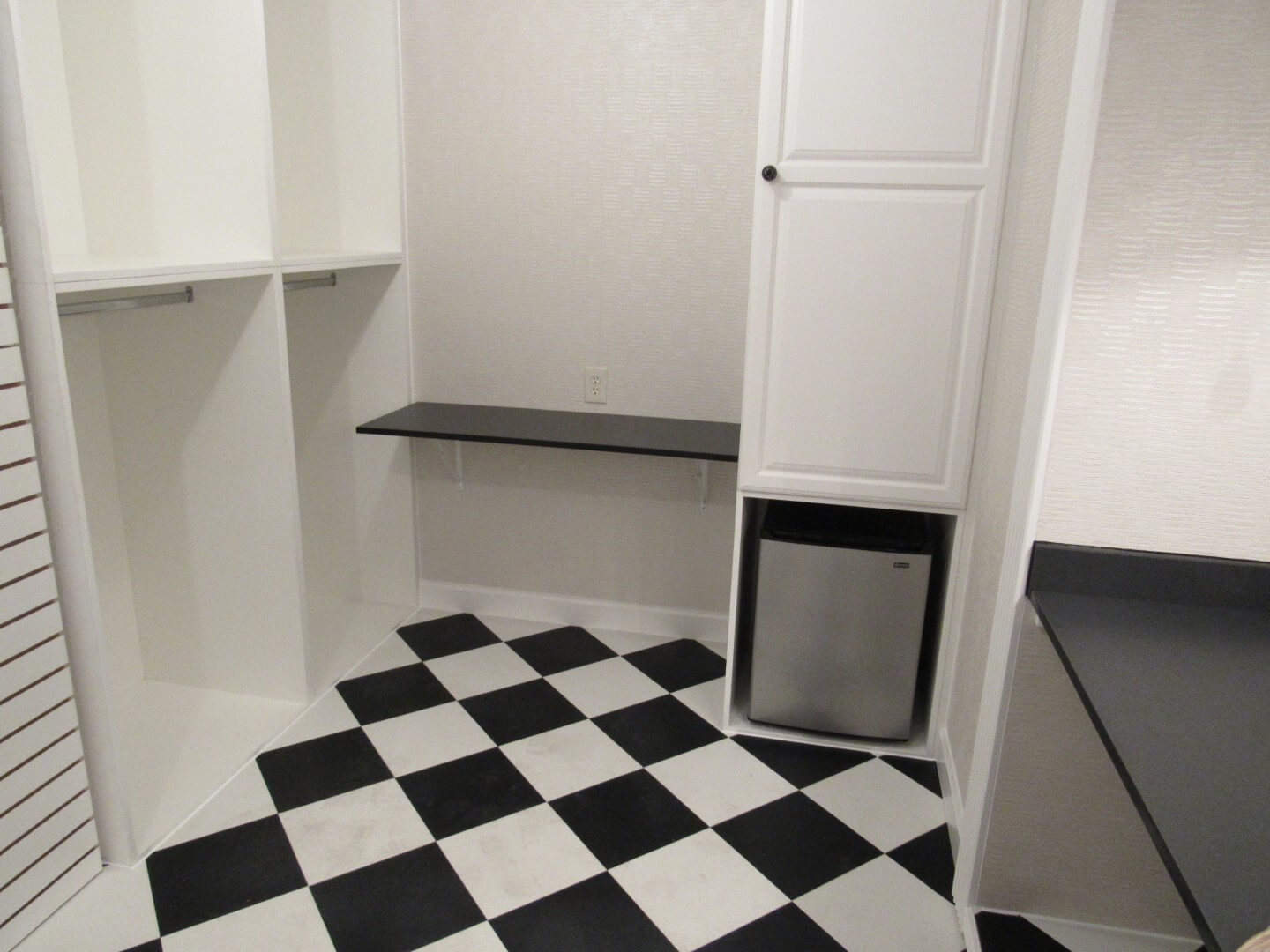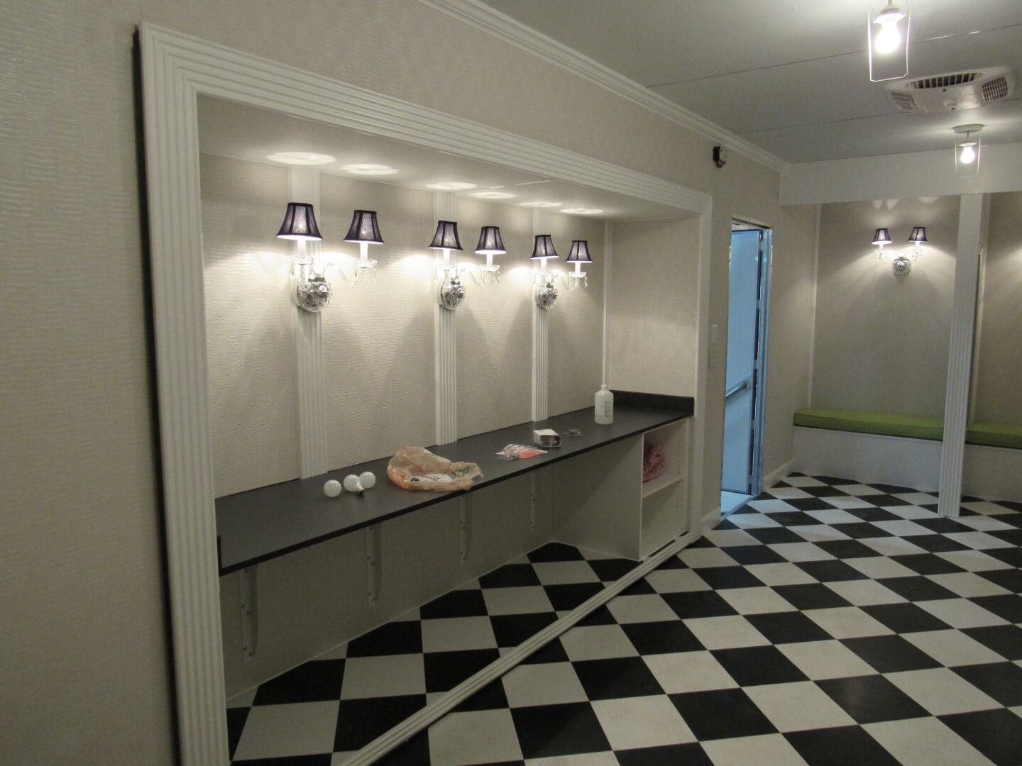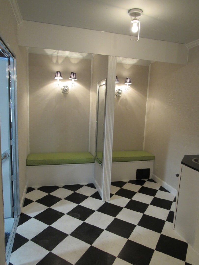 The interior of this mobile store trailer is designed with beauty, convenience and space-saving in mind. At the front, you’ll find two dressing rooms with benches and mirrors, a dividing wall down the center, and curtains for privacy. This unique feature brings in-store amenities on the go. Across from the door is a small handwashing sink in a custom-made corner counter, maximizing space. Down the streetside are custom compartments with a hanging rod in each bay, providing a unique way to display merchandise in a convenient space.
