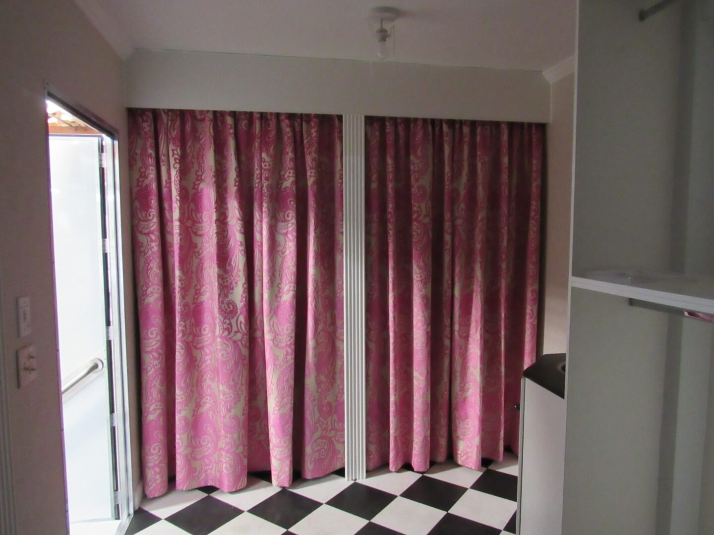 Two dressing rooms with benches, mirrors, and privacy curtains