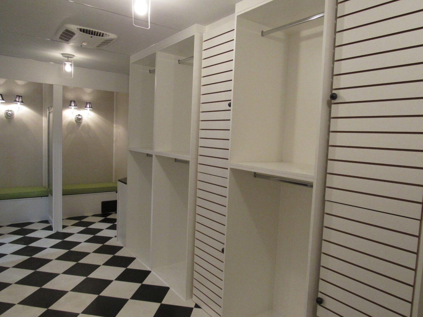 A counter, floor-to-ceiling cabinets and customer clothes hangers for versatile storage and display options