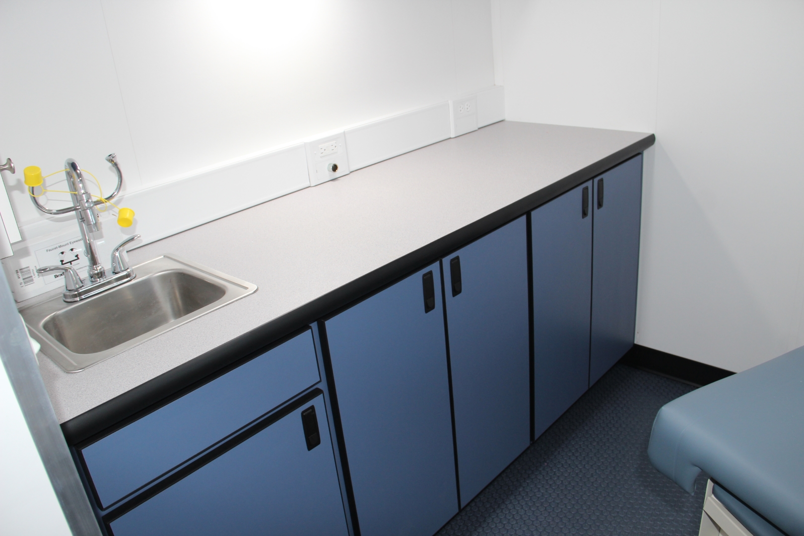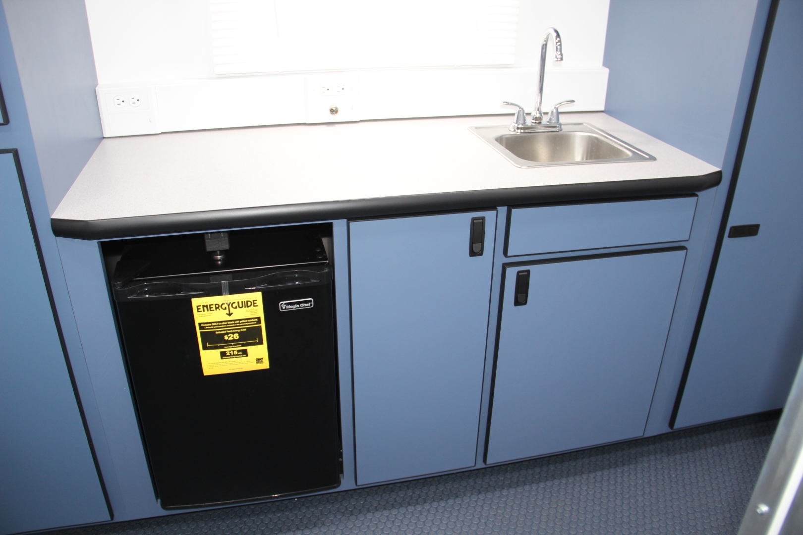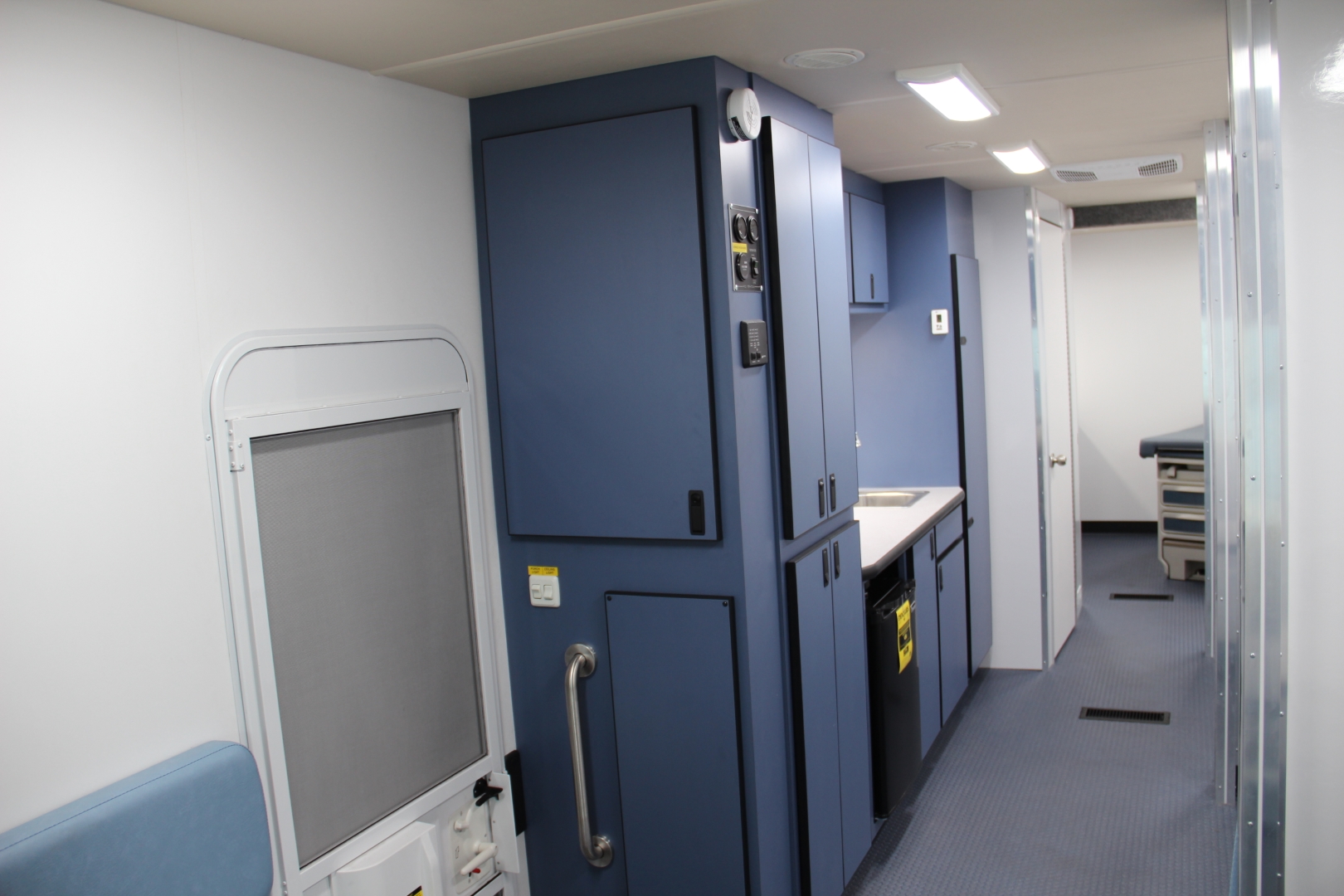 In addition, this mobile medical vehicle has individual waiting areas with padded benches that double as storage. Next to the waiting area is the galley area, which includes two floor-to-ceiling closets, overhead cabinets, a third handwash sink, an under-counter refrigerator, and a microwave.