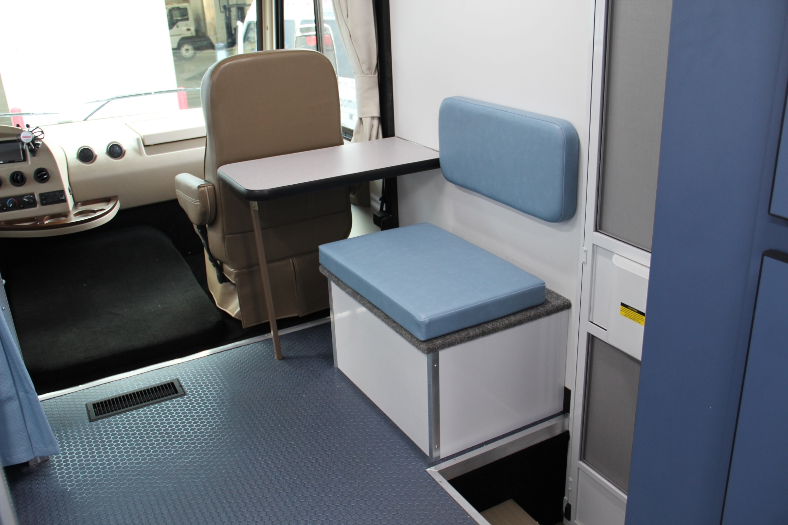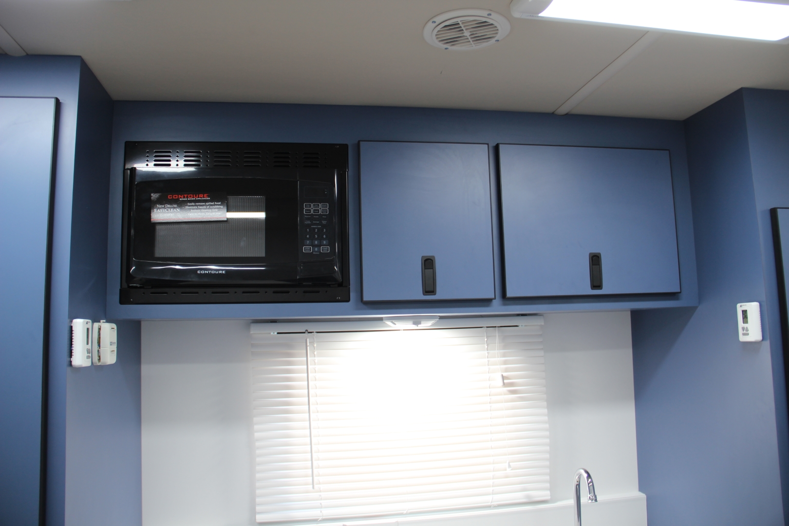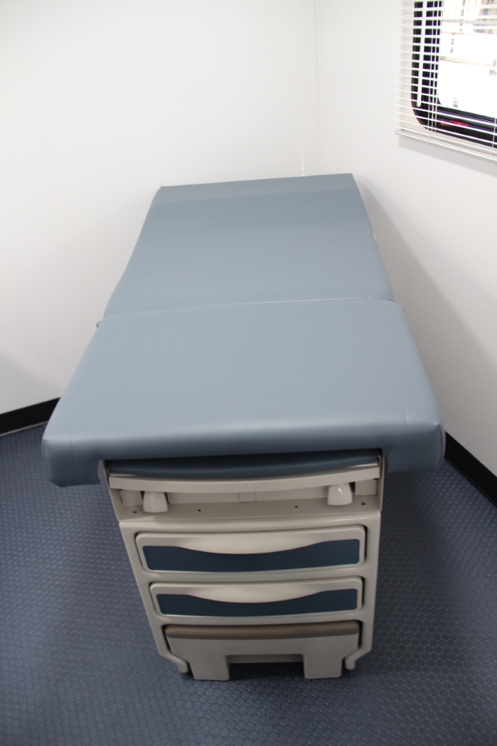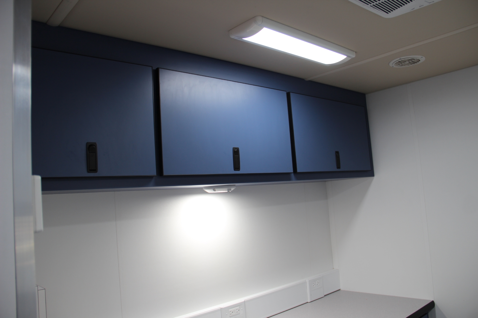 In addition, this mobile medical vehicle has individual waiting areas with padded benches that double as storage. Next to the waiting area is the galley area, which includes two floor-to-ceiling closets, overhead cabinets, a third handwash sink, an under-counter refrigerator, and a microwave.