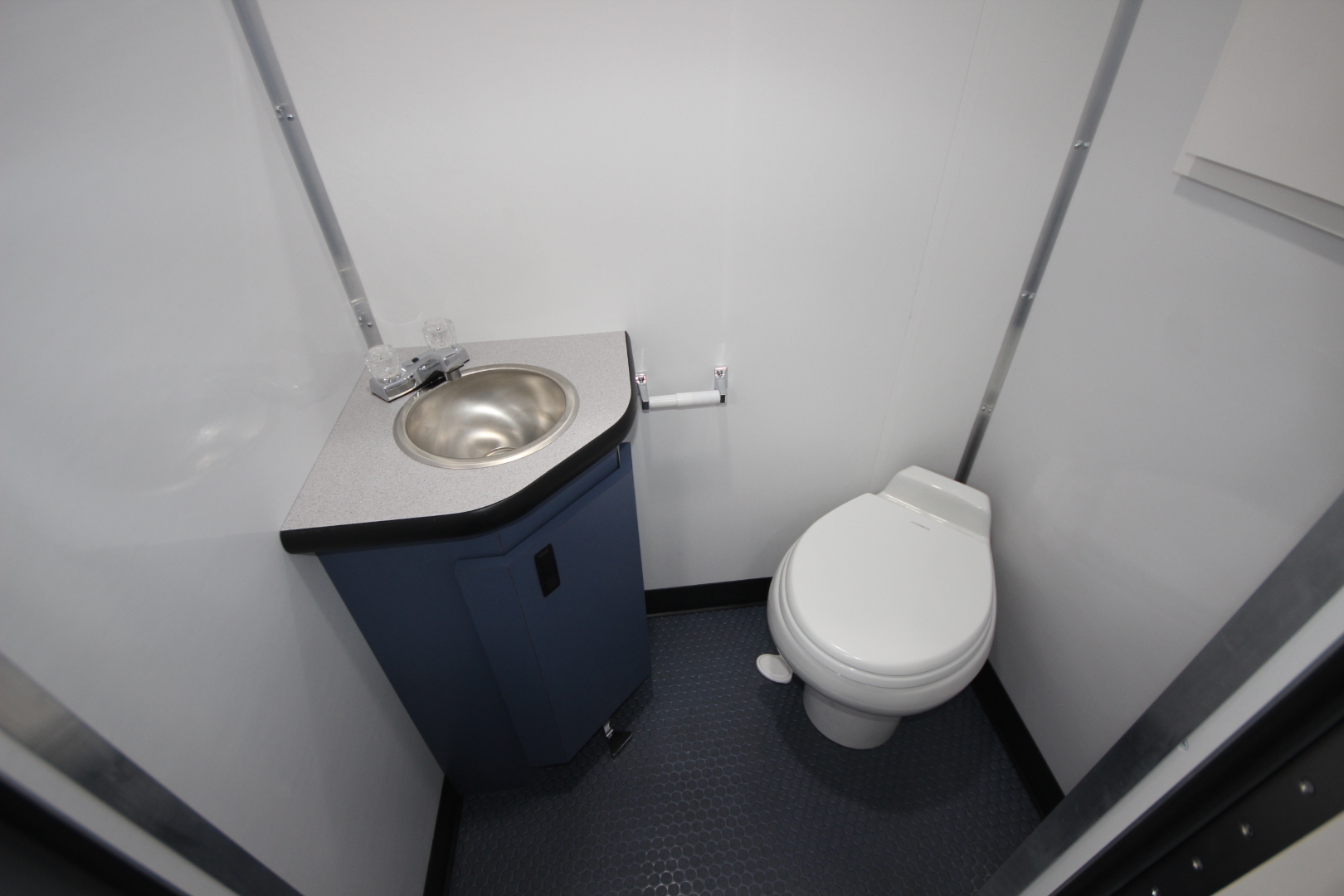 Inside the restroom is a foot-operated toilet, stainless steel sink, mirror, ventilation fan, and a small slot door to deposit urine samples to the provider in the rear exam room.