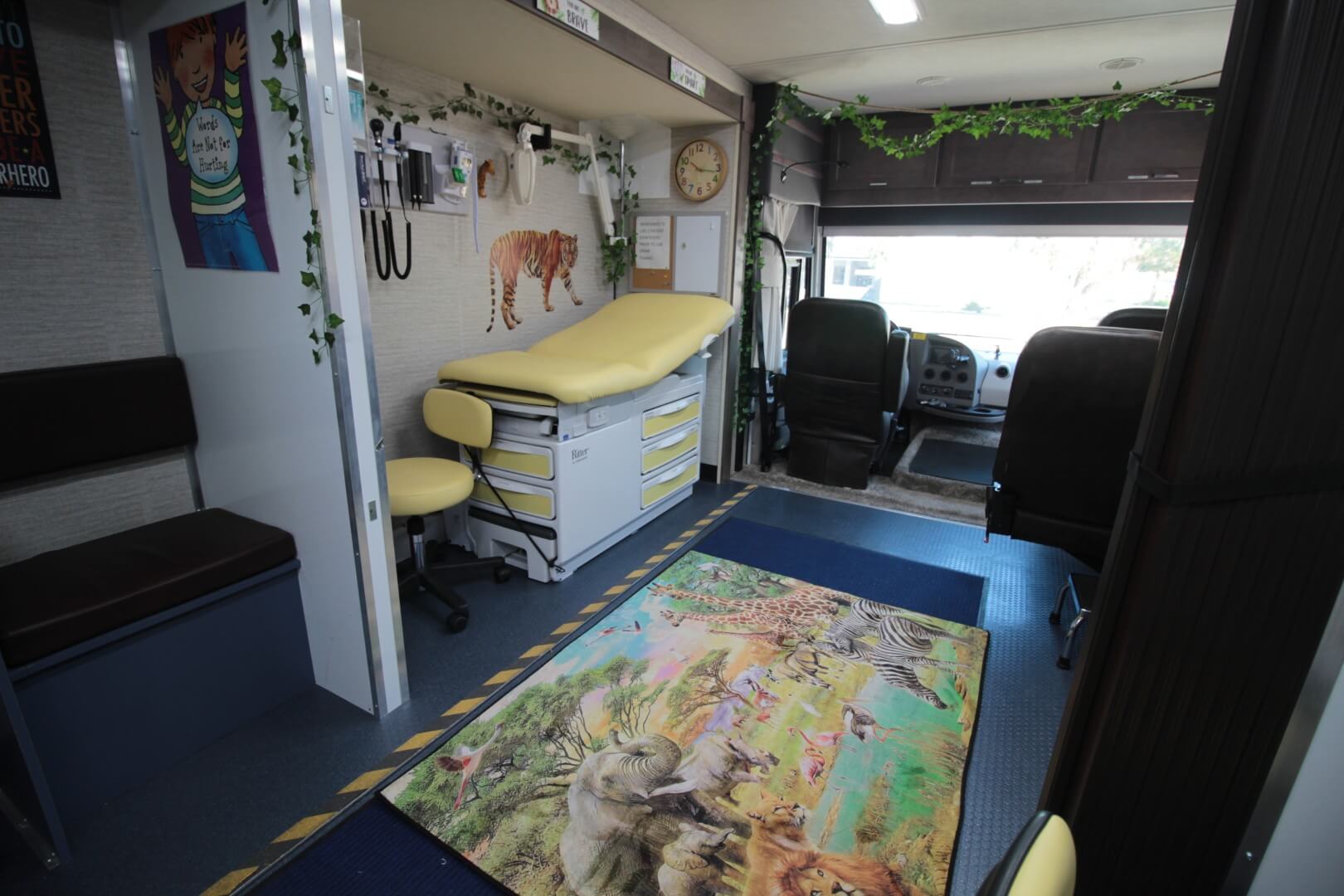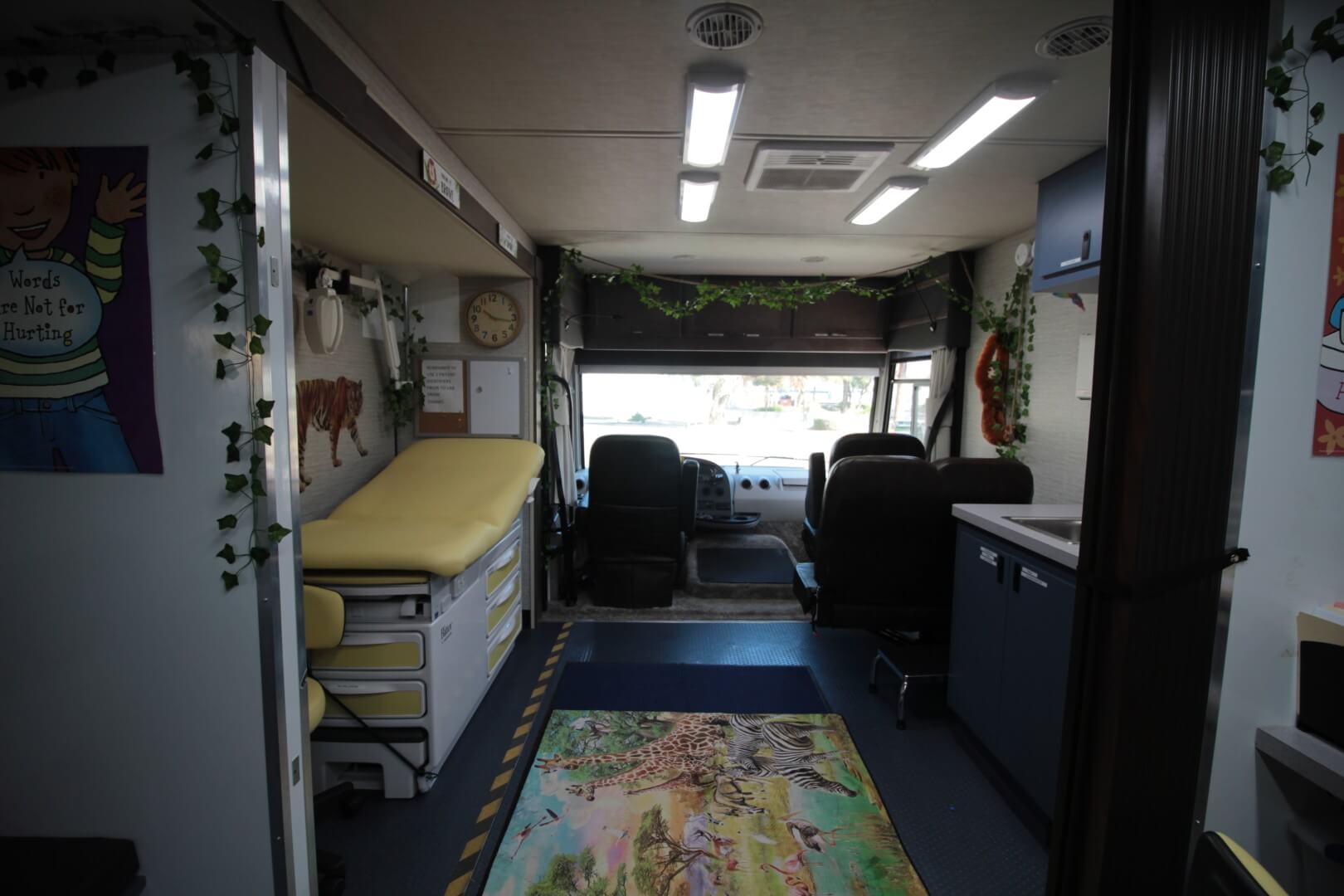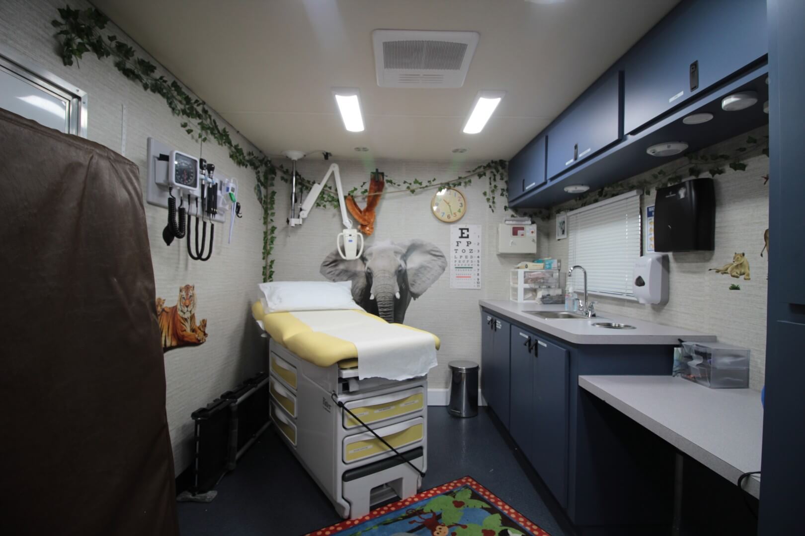The coach includes two private exam rooms, each outfitted with exam tables, diagnostic boards, ample cabinetry, and handwashing sinks to support a wide range of clinical procedures. Accordion and pocket doors safeguard patient privacy throughout the coach.