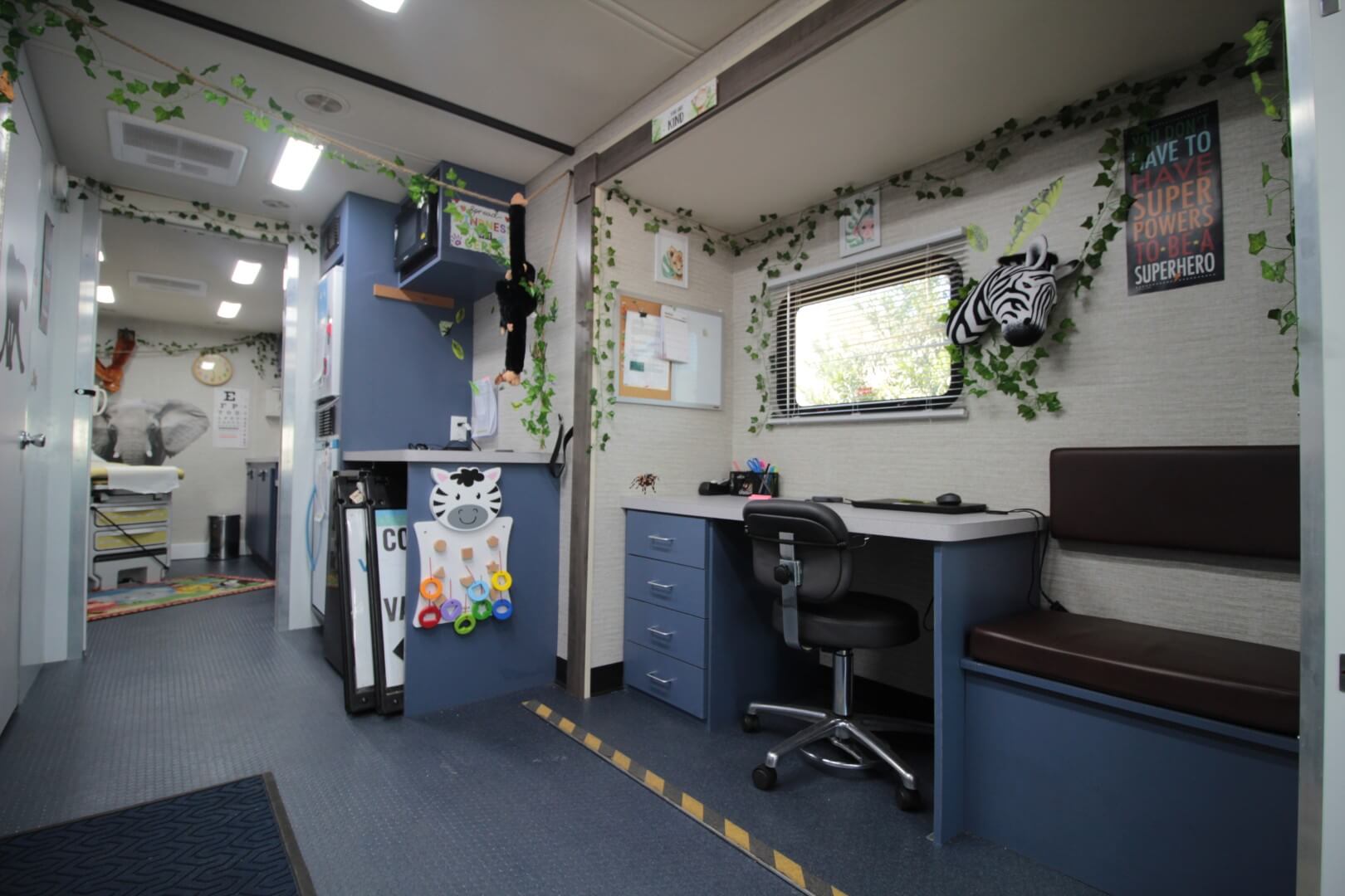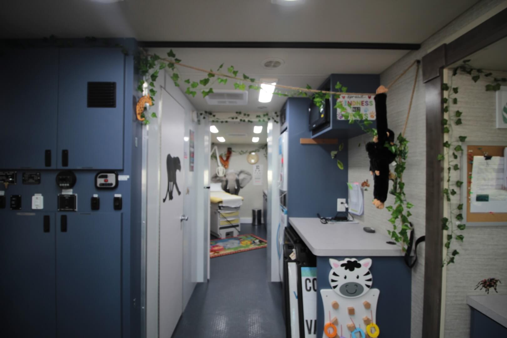 The rear exam room is ADA accessible via a wheelchair lift, with an angled exam table for improved workflow and maneuverability. Additional workspaces—including a sitting‑height desk, overhead cabinets, and a floor‑to‑ceiling storage closet—ensure that staff have everything necessary for efficient operation.