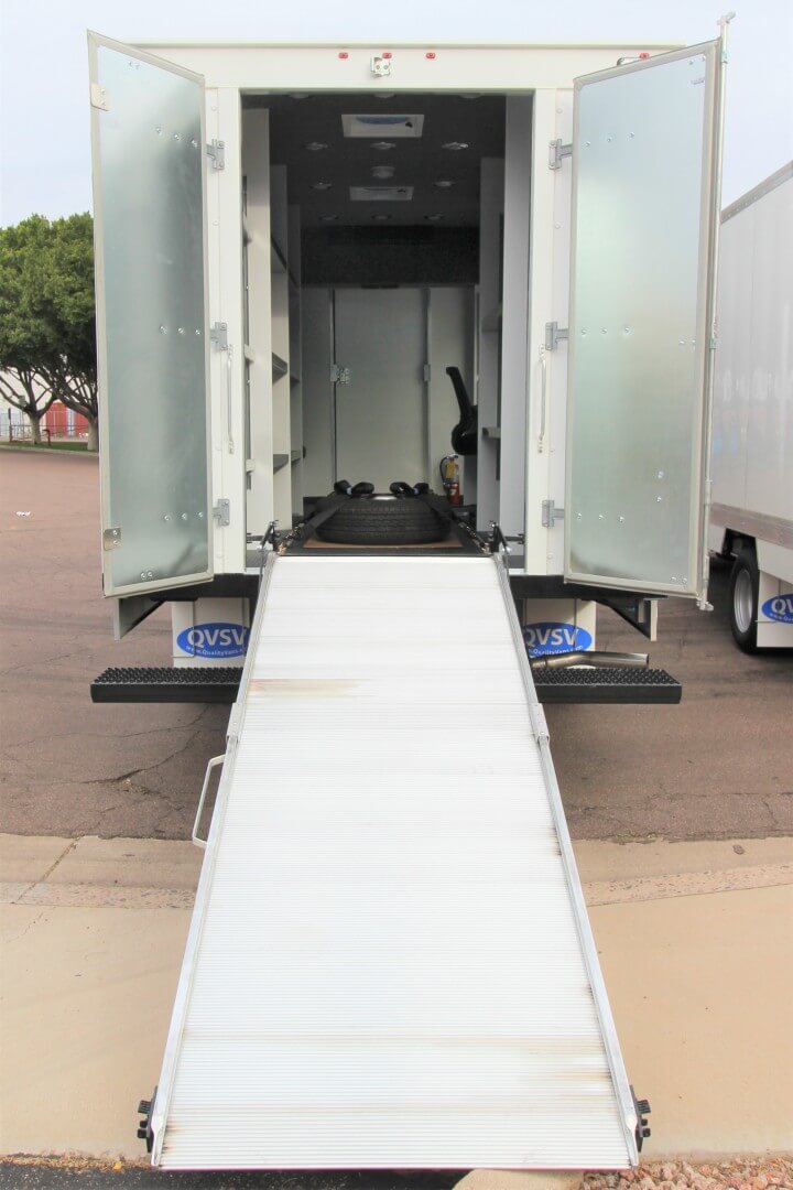 Bi-fold rear ramp provides easy loading for heavy EOD equipment transported on dollies—such as robots, X-ray panels, disruptors, and containment tools