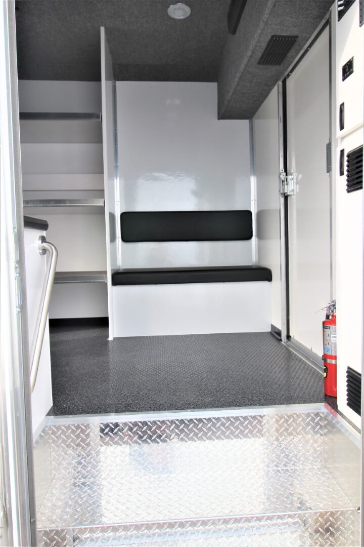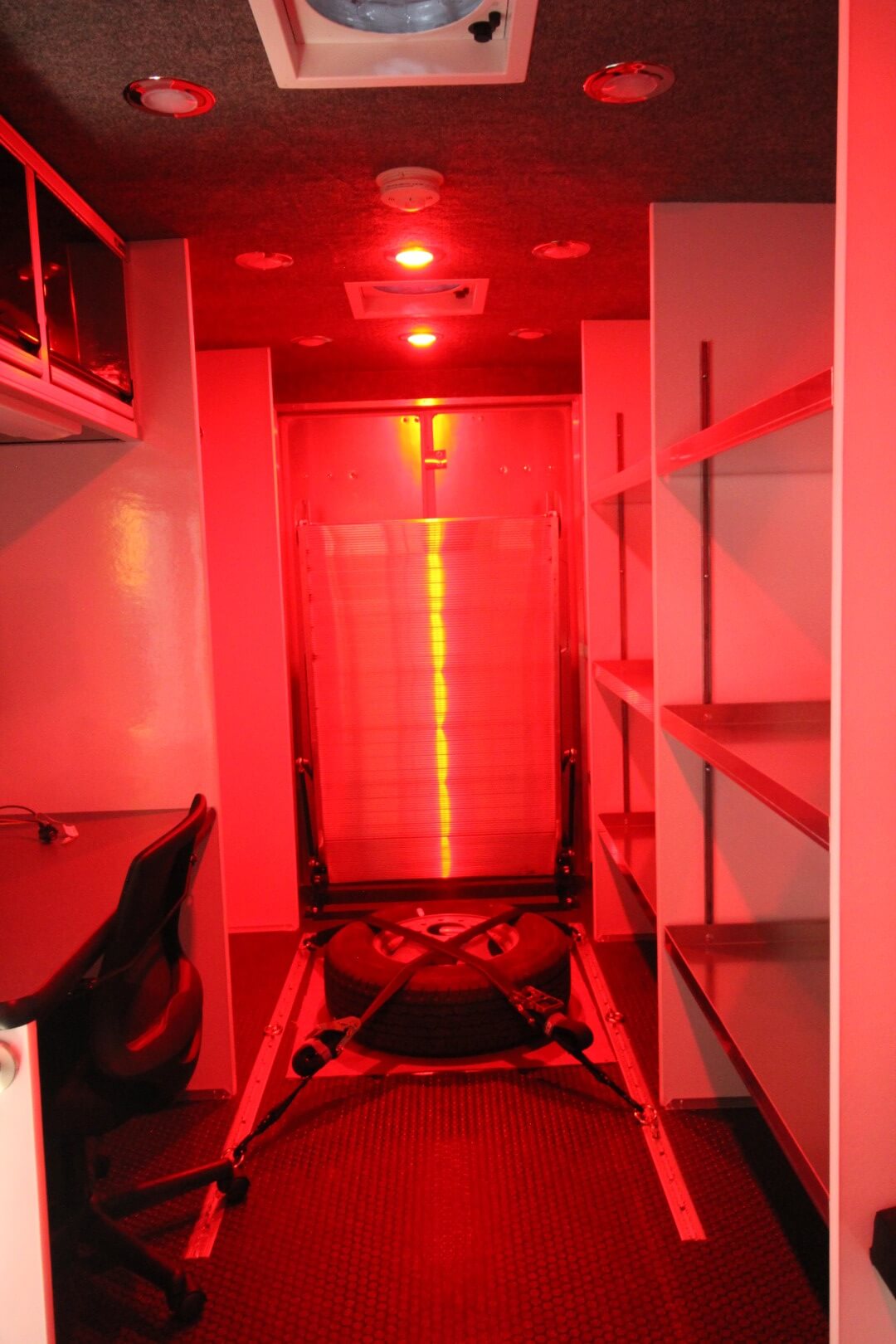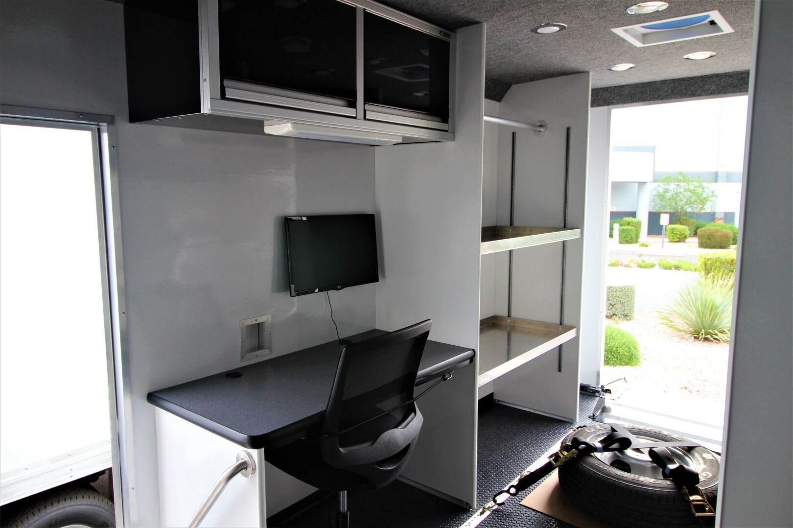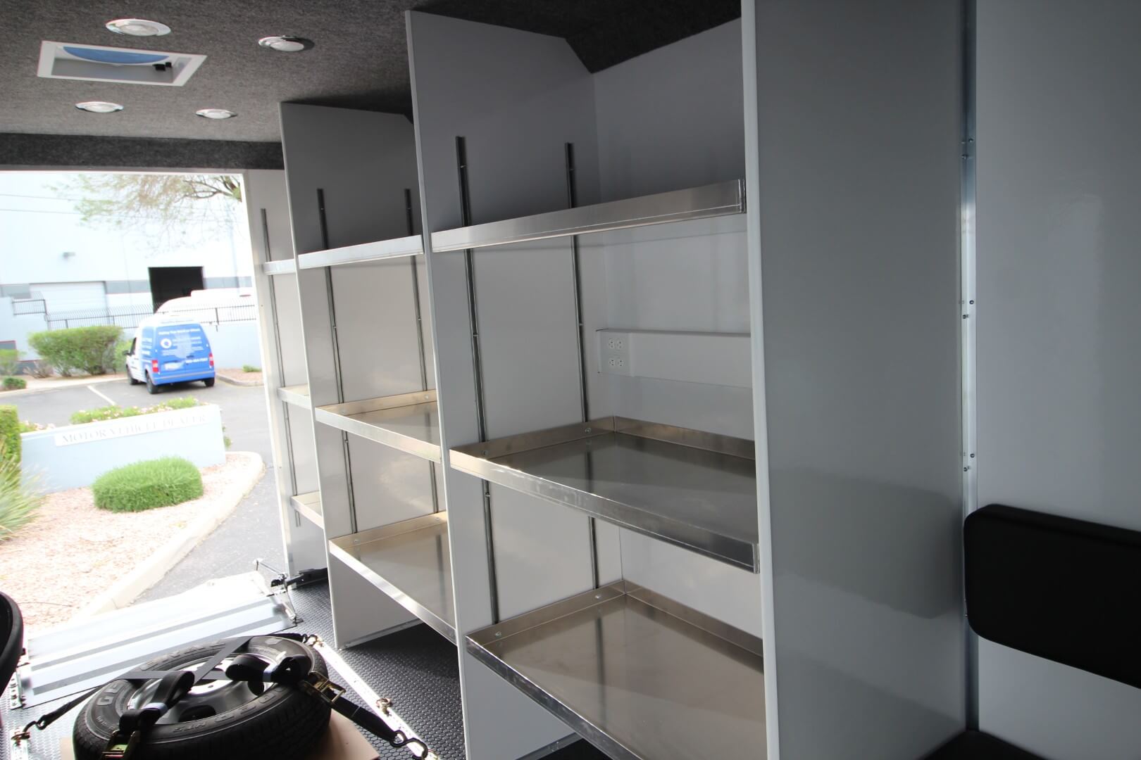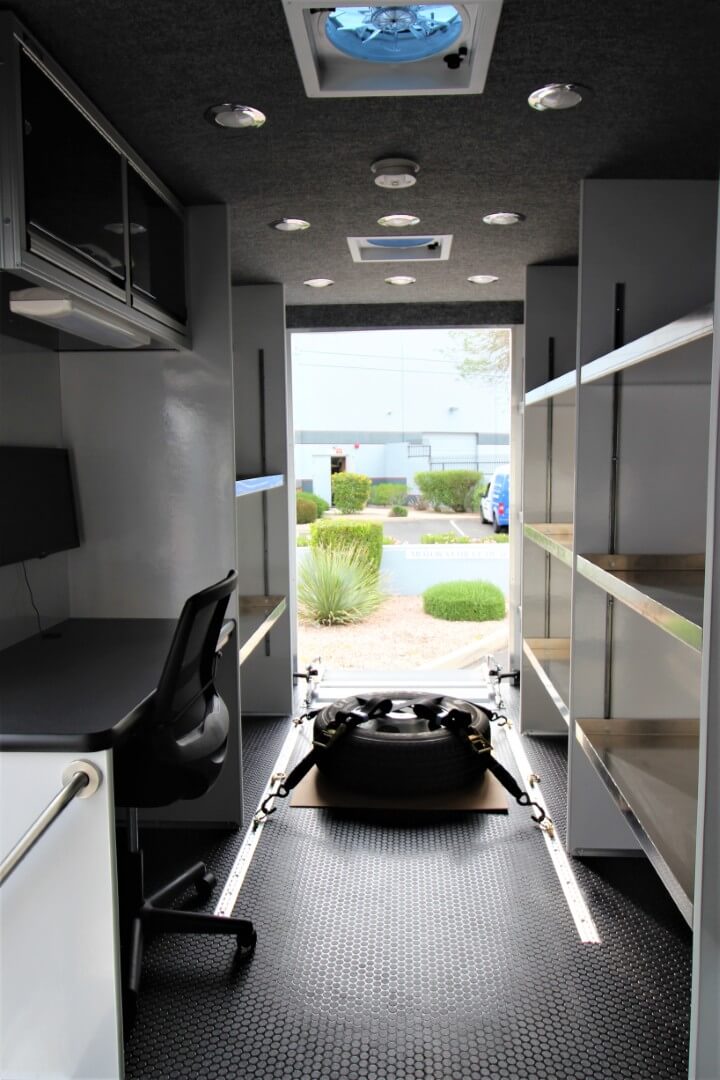 Three adjustable aluminum shelves on the driver’s side for tools, sensors, and mission critical gear