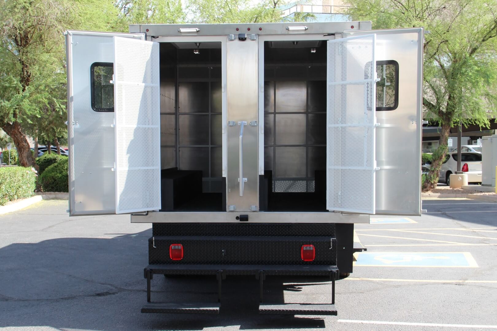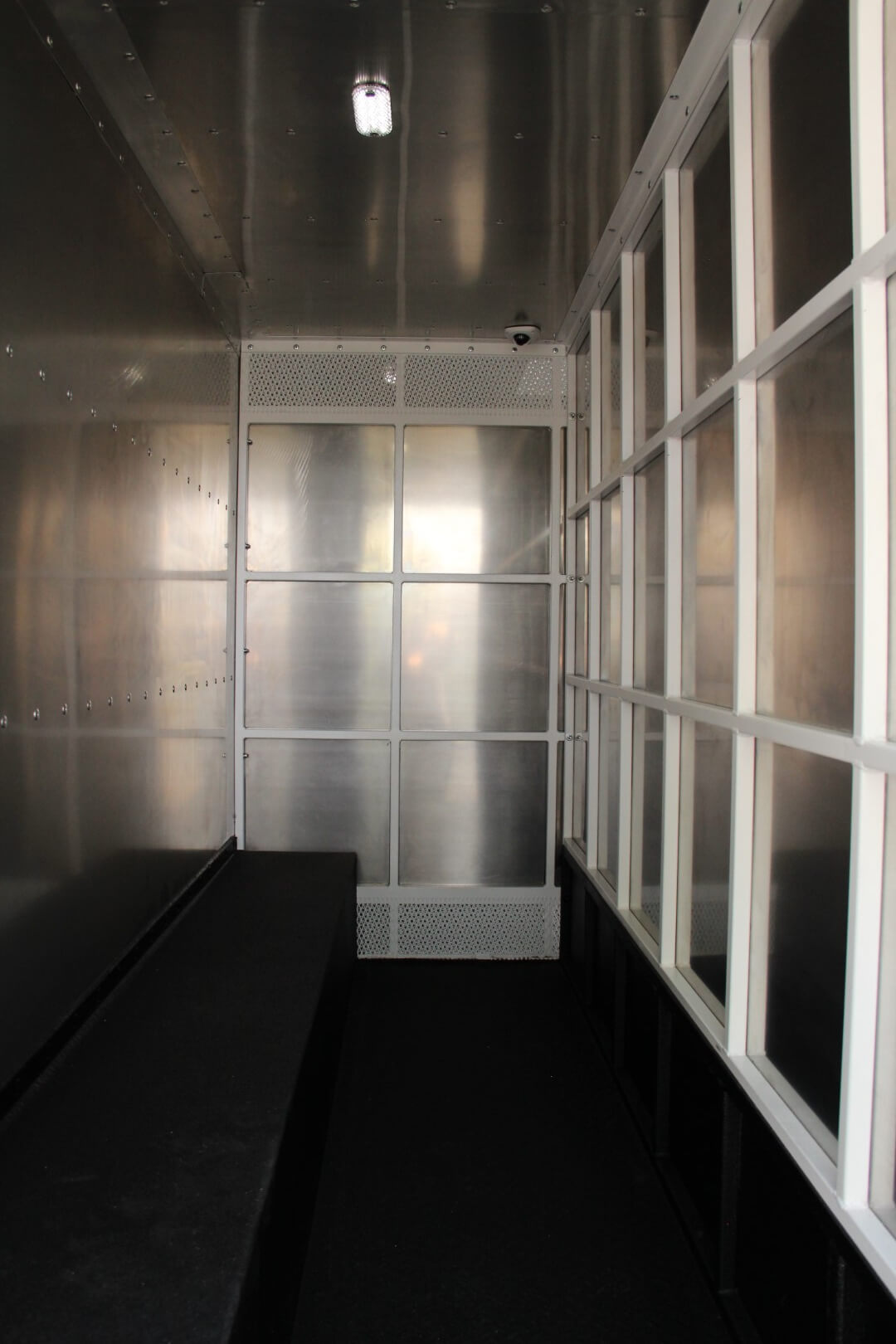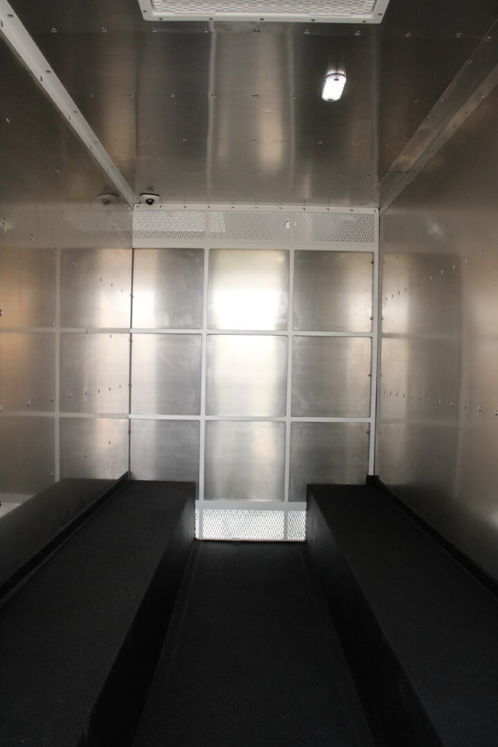 Access to the vehicle’s compartments is secured via reinforced doors—one located on the passenger side, and another at the rear. The passenger side is designed with a door located near the front of the shelter and it includes a secondary caged access point inside the first door, allowing personnel to have a full visual into the compartment before fully opening it, significantly enhancing security and officer safety during prisoner transfers. Additionally, an aluminum sheeting wall separates the front compartment from the rear, further boosting protection. An L-shaped, durable bench along the rear and driver’s wall provides seating for prisoners during transport.