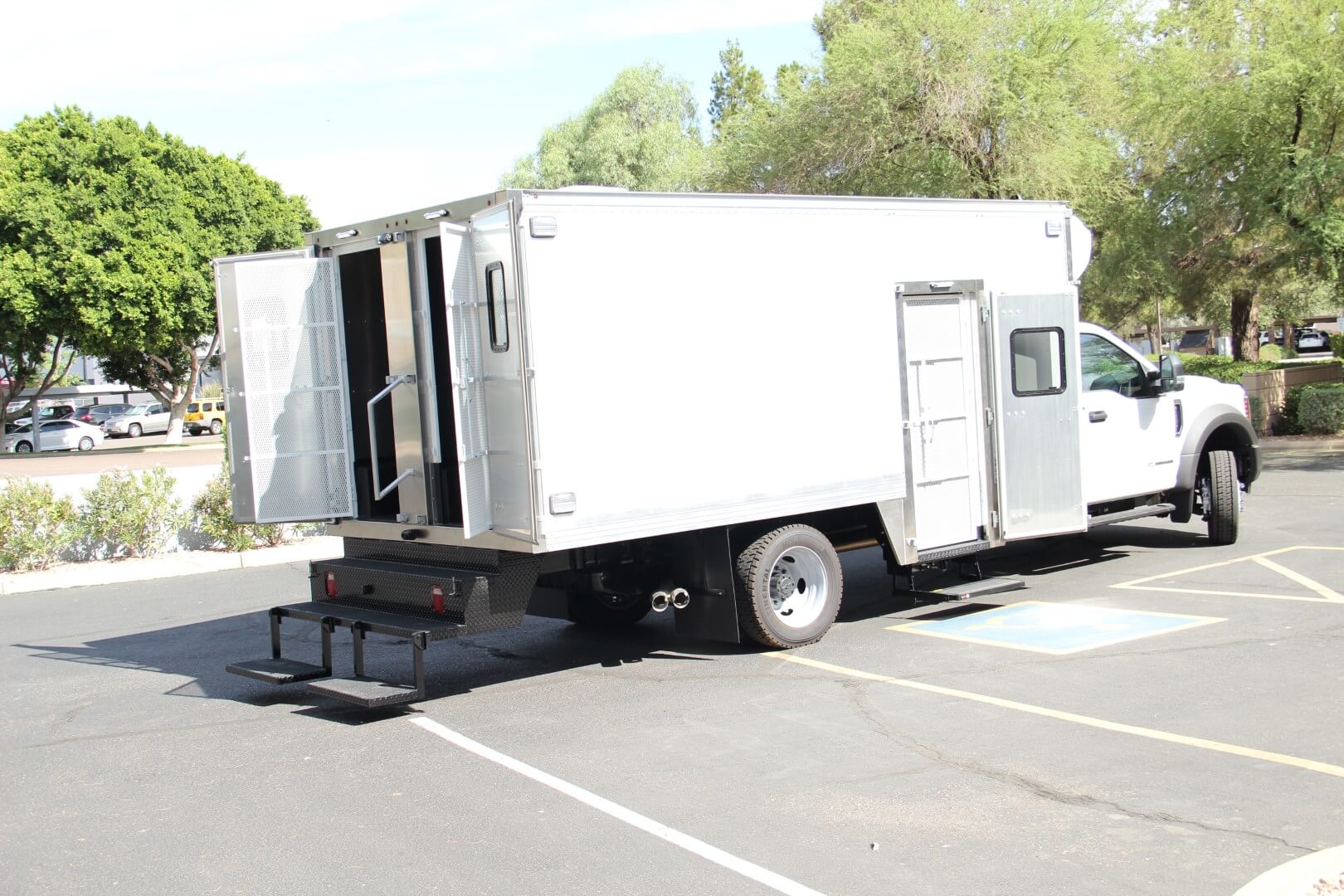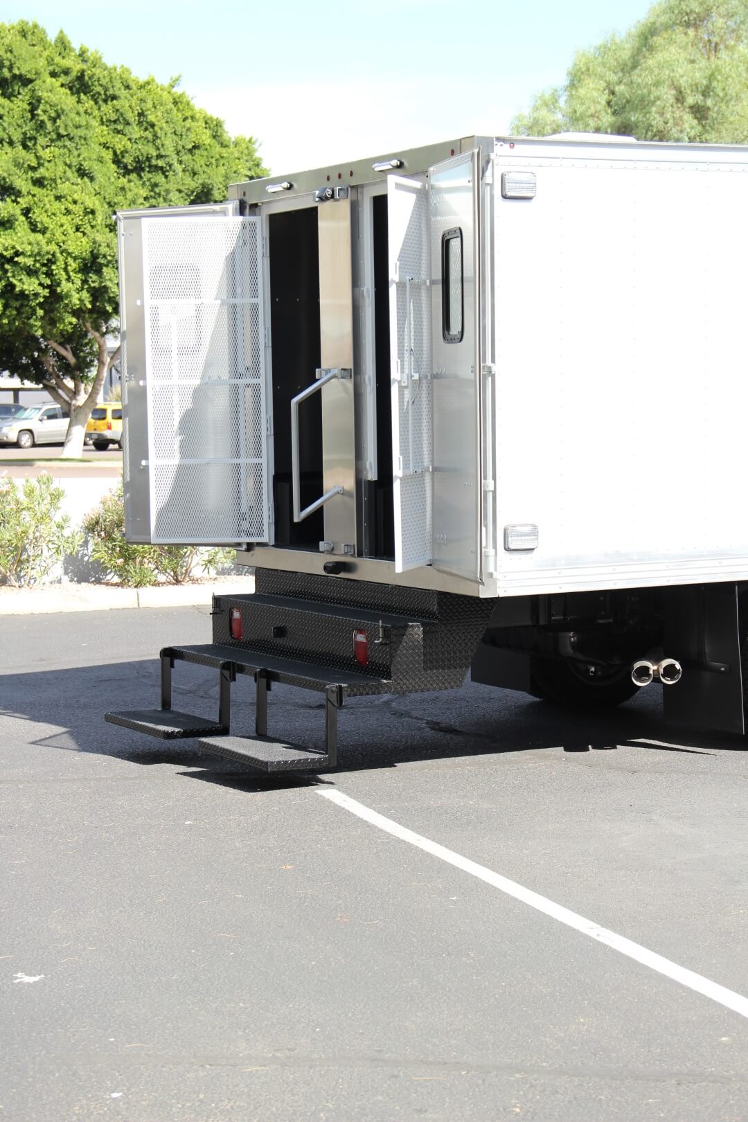 Convenience in accessing the rear compartments is ensured by a specially engineered three-step bumper, designed in-house for strength and stability, able to endure substantial foot traffic over time. Inside the driver’s side rear compartment, benches are arranged along both side walls for added seating. Meanwhile, the passenger side compartment features a single bench along the outer wall for maximized space. These compartments are also partitioned by a solid aluminum sheeting wall, with secure access provided through both rear doors and their respective see-through secondary caged doors, fostering a safe environment for all occupants and public safety personnel.