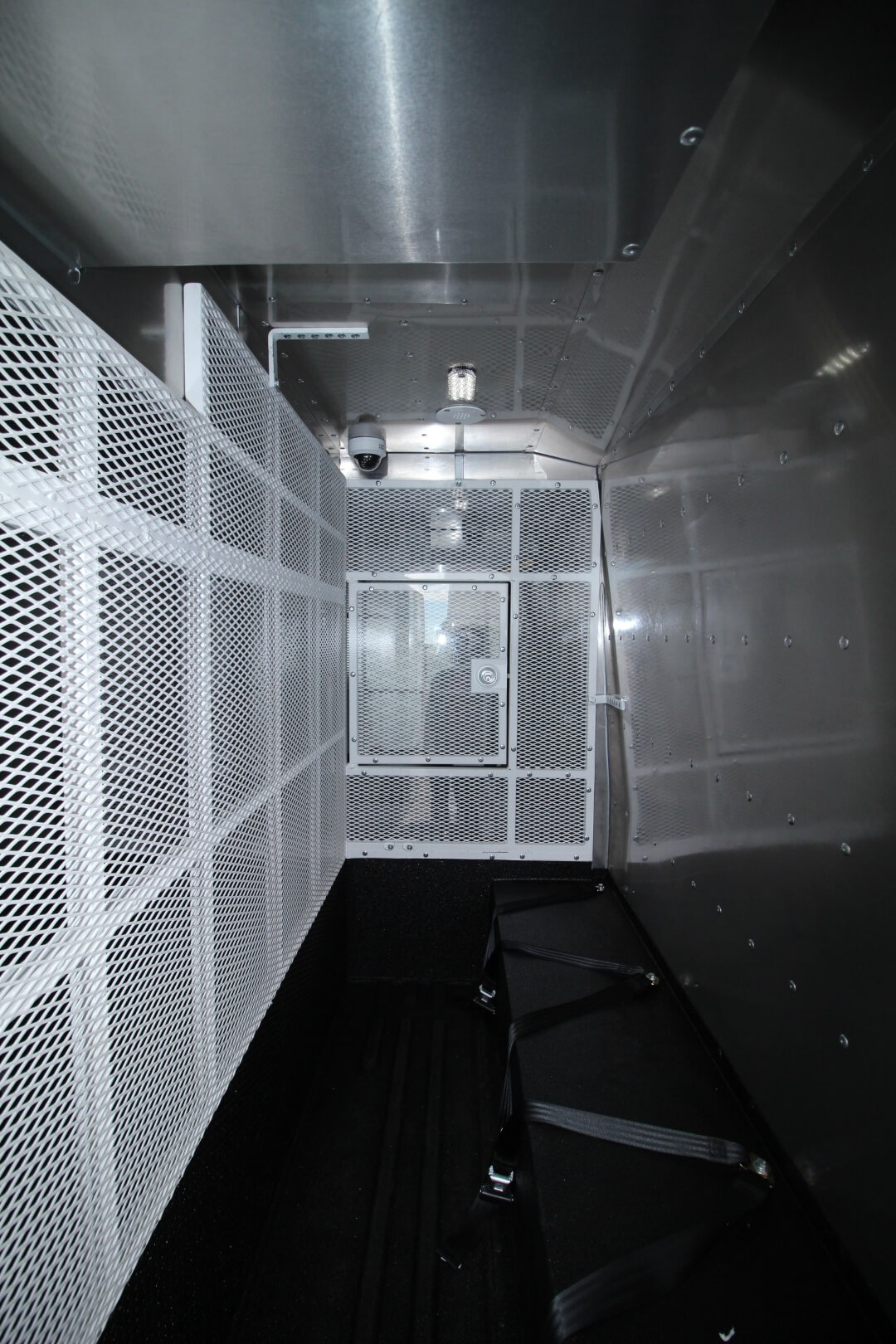 Equipped with front facing and rear facing benches, with capacity for up to three inmates per bench.