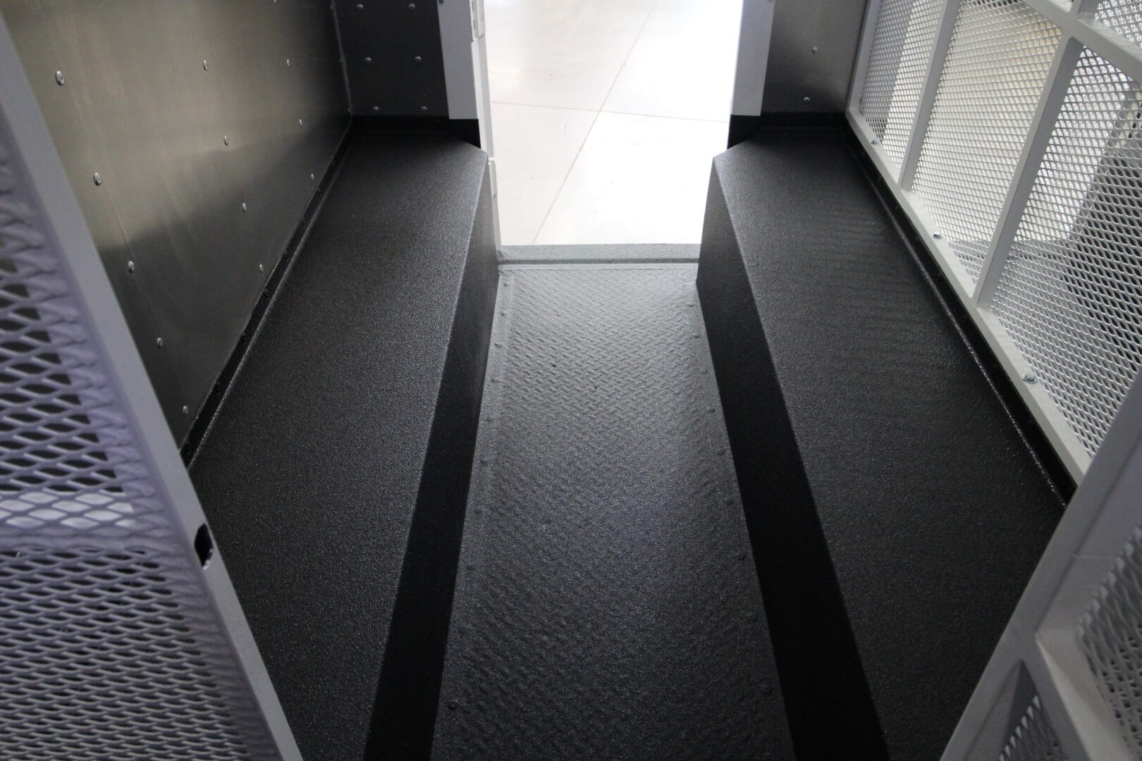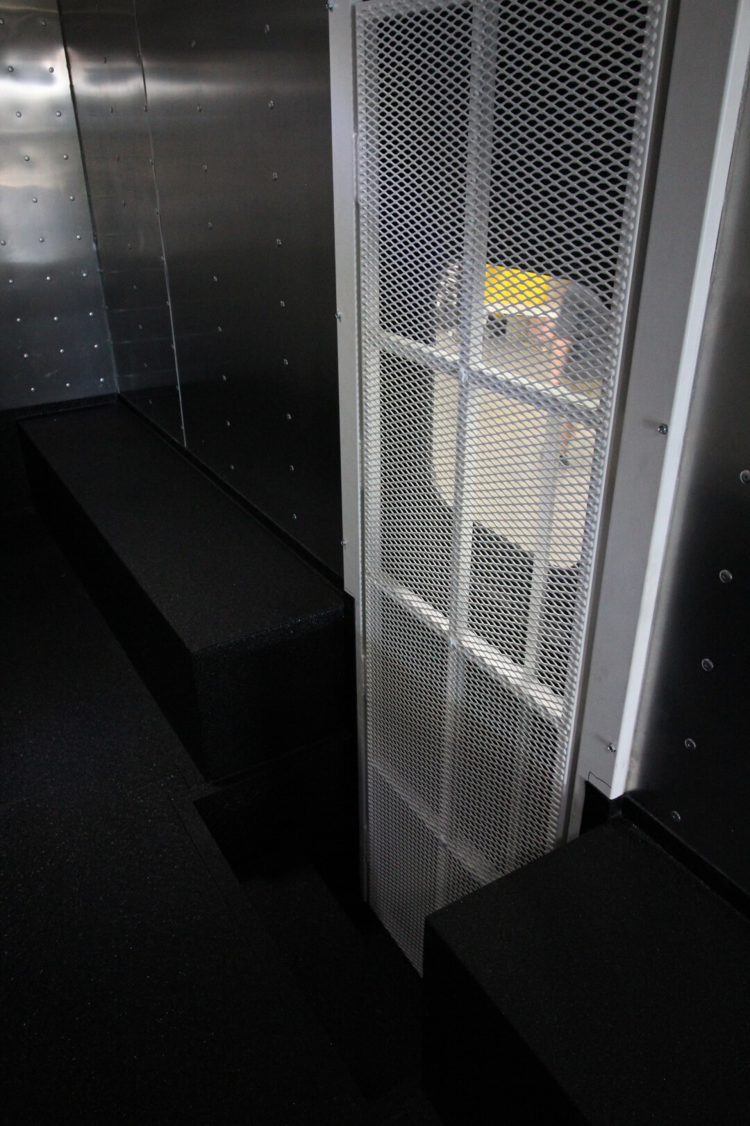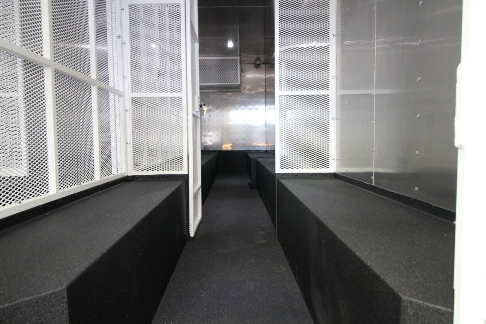Benches along the driver’s side position inmates against reinforced walls for added safety