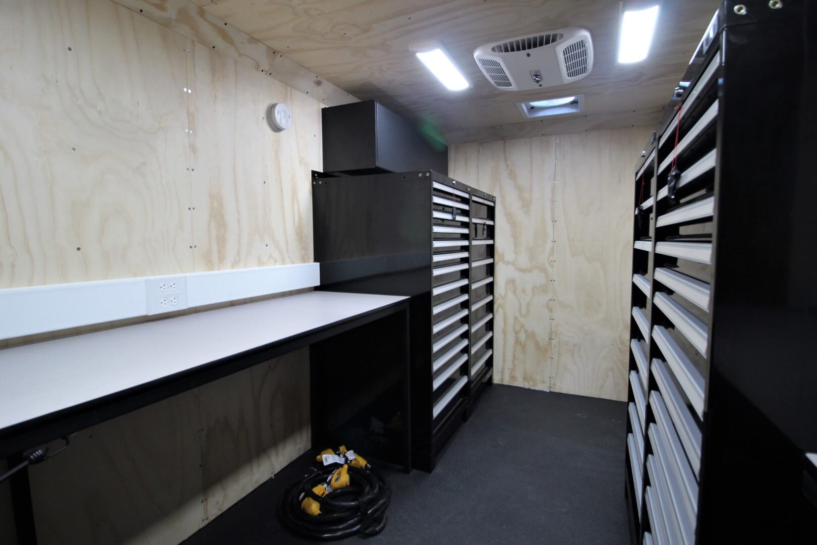 Inside the 14′ shelter, the layout is optimized for organization and professional workflow.