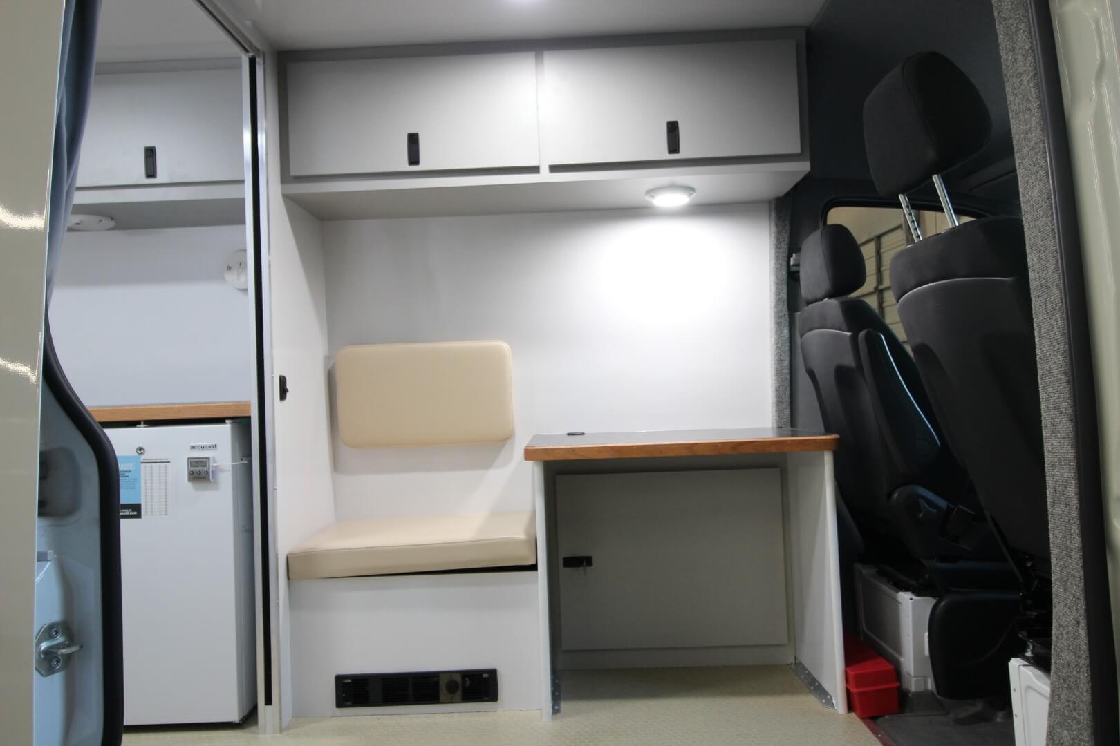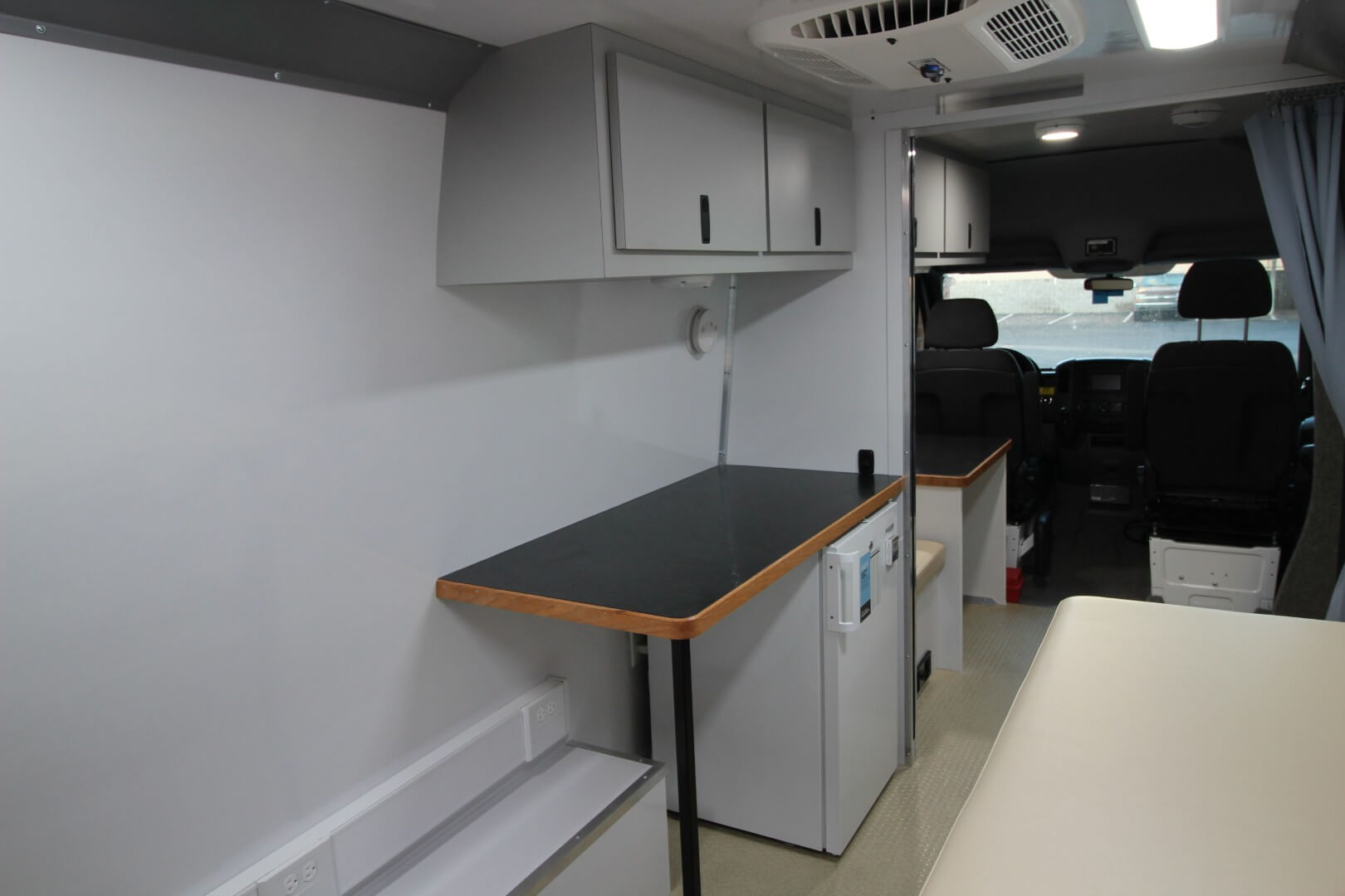 Inside, the van features a thoughtfully designed clinical layout. Splitting the vehicle into two dedicated work areas, separating the intake station from the rear medical area, improving patient confidentiality and creating a professional clinical atmosphere.