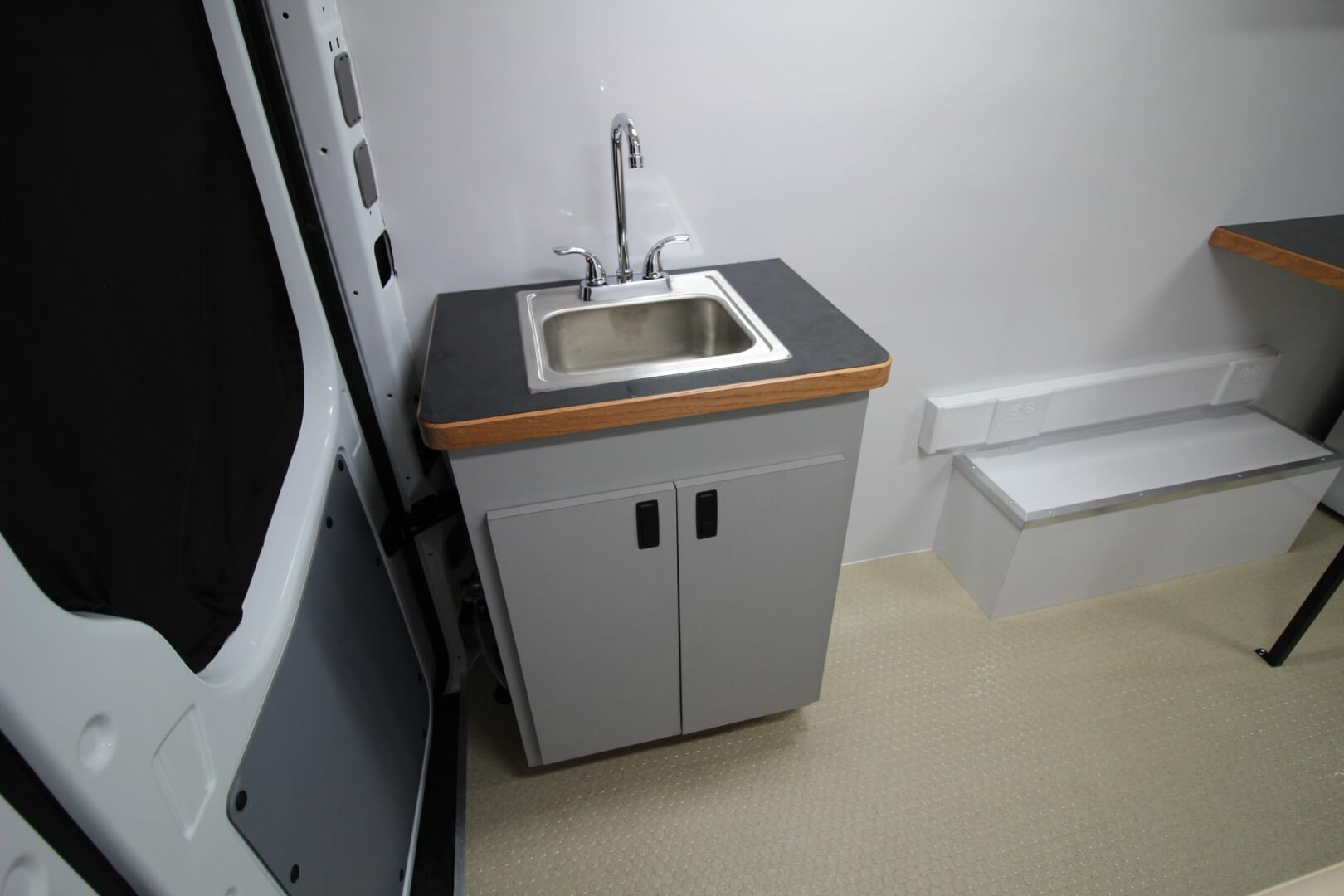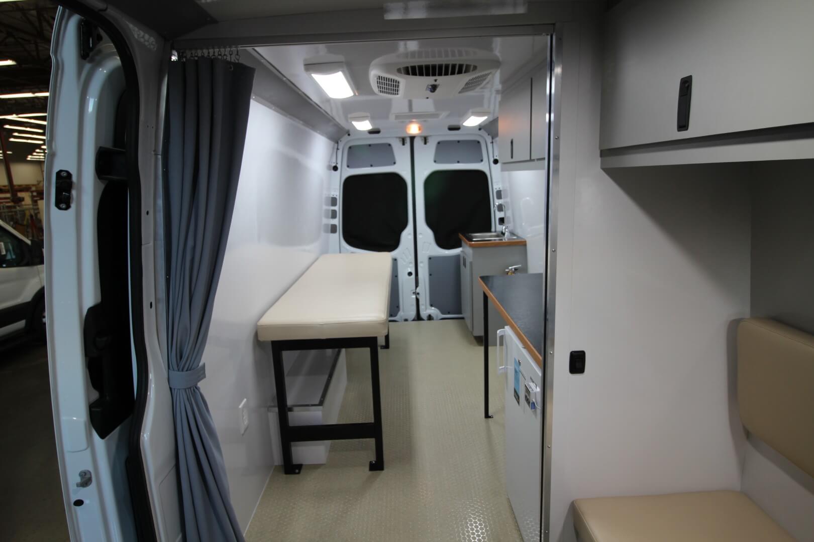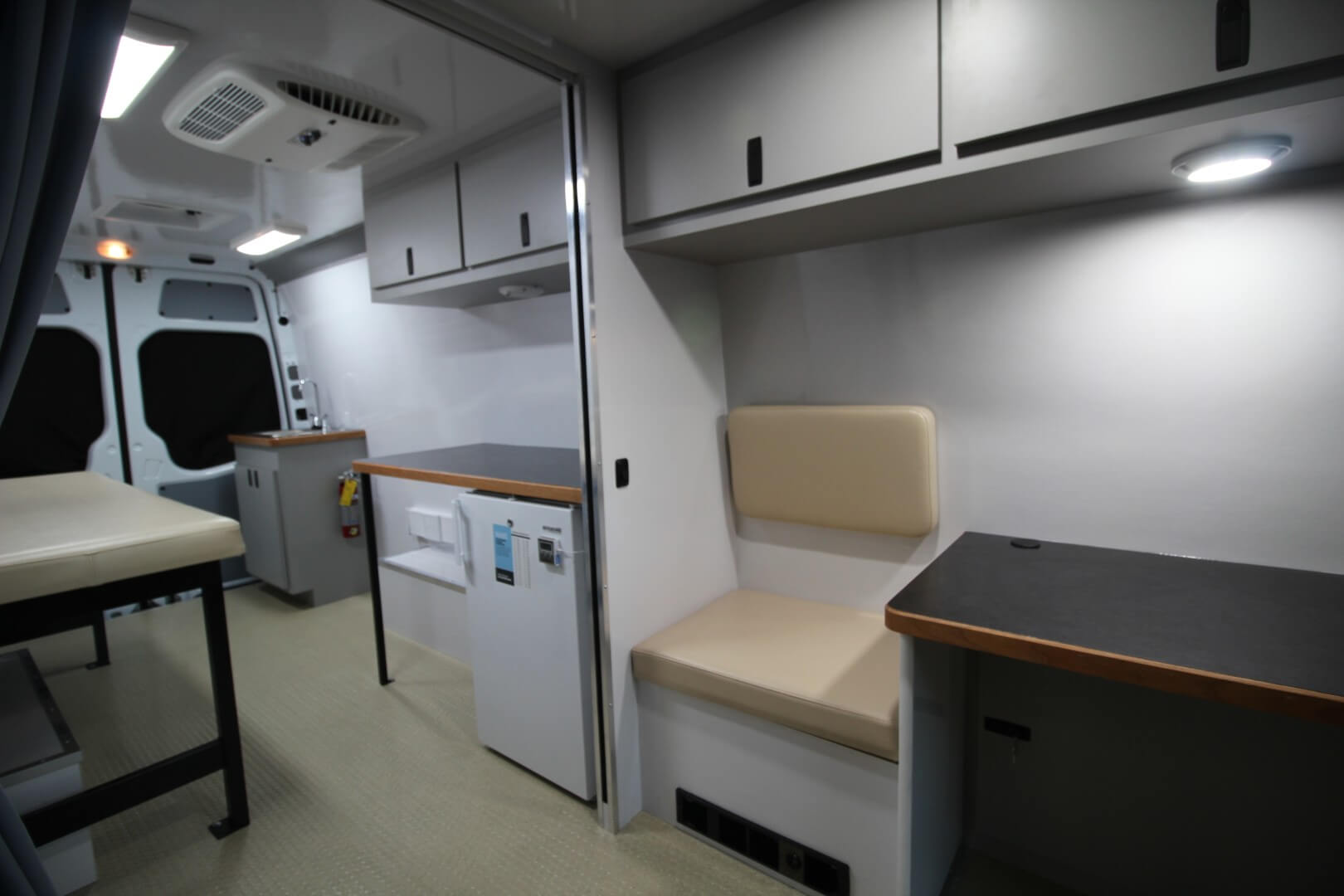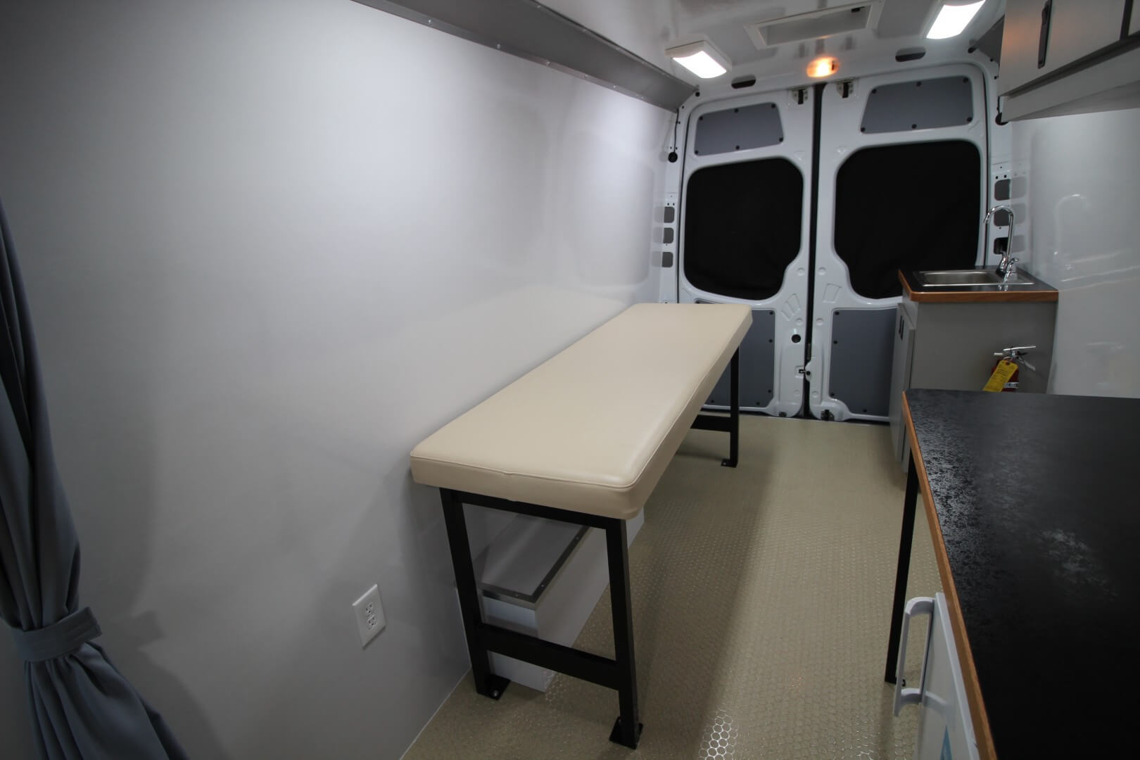 The exam area at the back of the van is enclosed with a privacy curtain and equipped with a custom-built medical bed sized for comfort and efficient examinations.