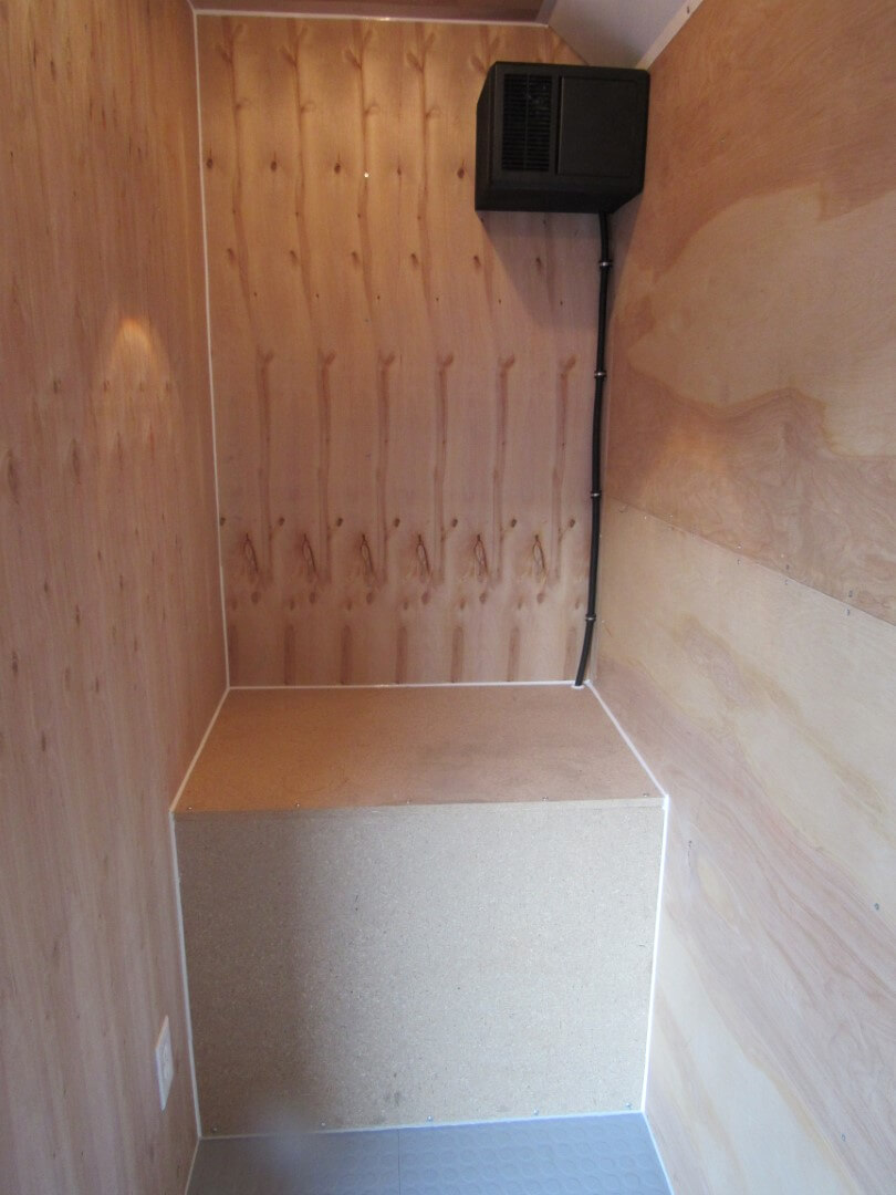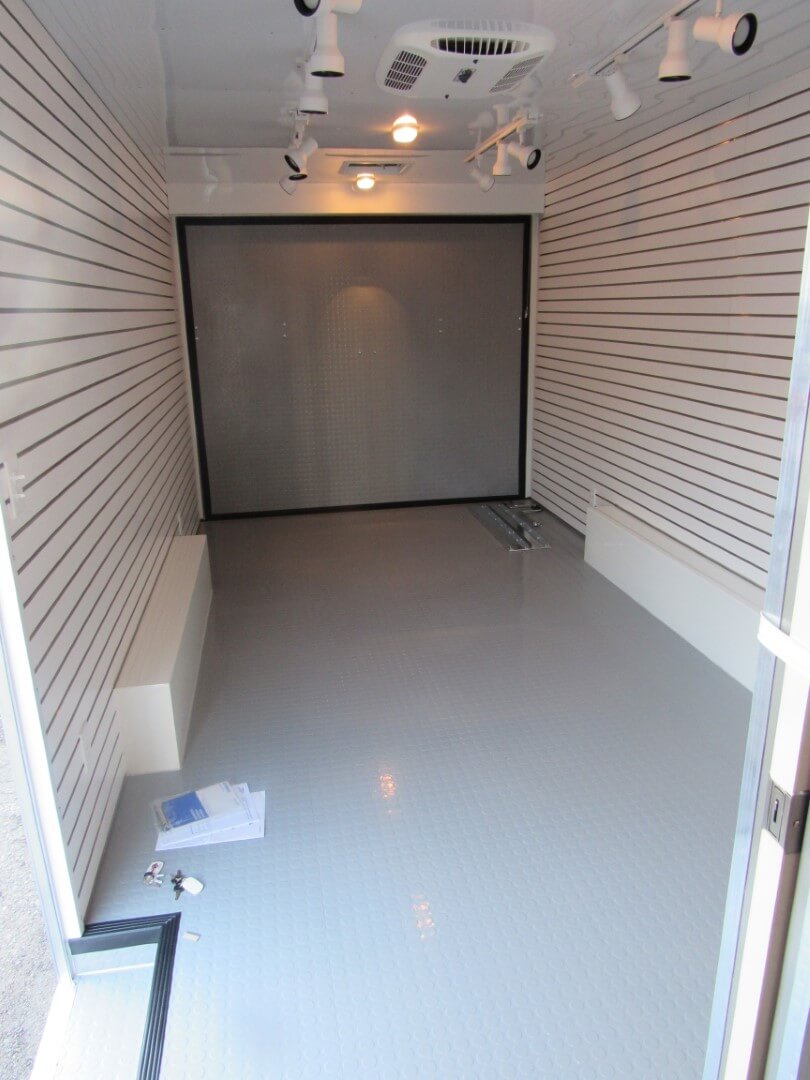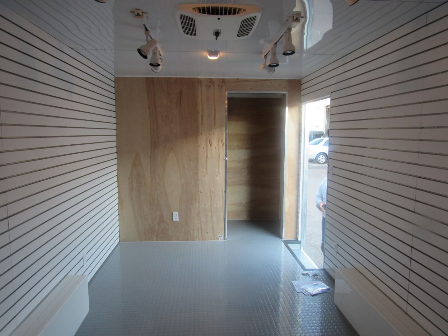 The interior includes a partition wall with a pocket door near the entry, providing ample storage space for various needs. The walls are slated to allow for the attachment of hooks, small shelves, and other accessories, offering flexibility to adapt the vehicle to different event requirements.