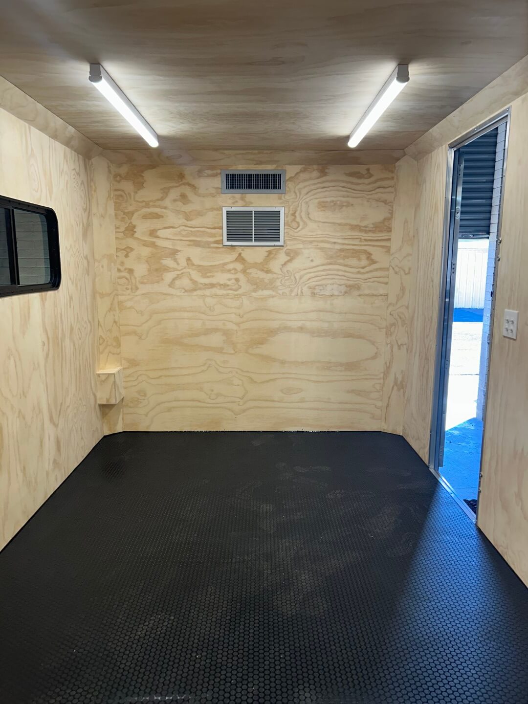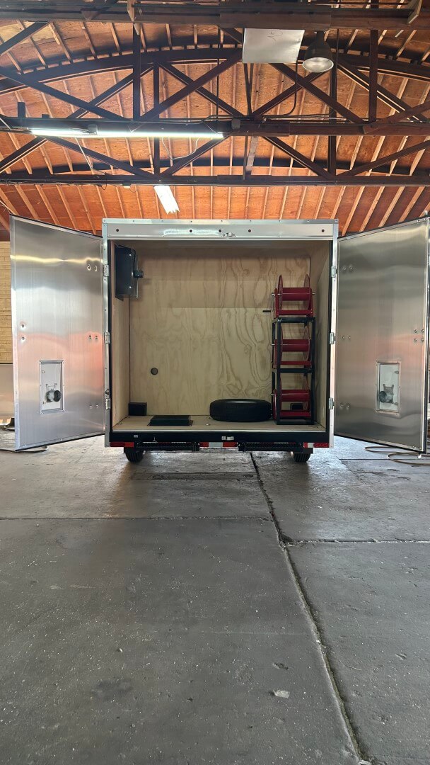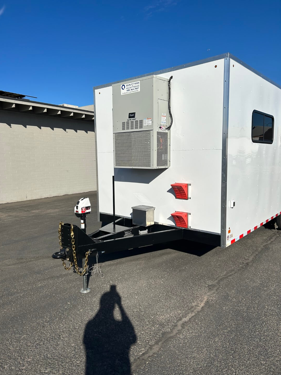 We built this trailer to meet the customers’ needs and to their specifications. Once delivered, additional critical testing equipment to suit workers needs in the field was installed. We provided a strong, long-lasting platform for to serve in the harsh Arizona summers with an extremely high load capacity. The unit was built utilizing close foam insulation that will help the front wall mounted Bard HVAC unit keep the unit cool during use. Additionally, there is a road cone holder attached to the front tongue of the trailer. On the driver-side wall, a small locking pass through door is installed at the front corner of the wheel well.