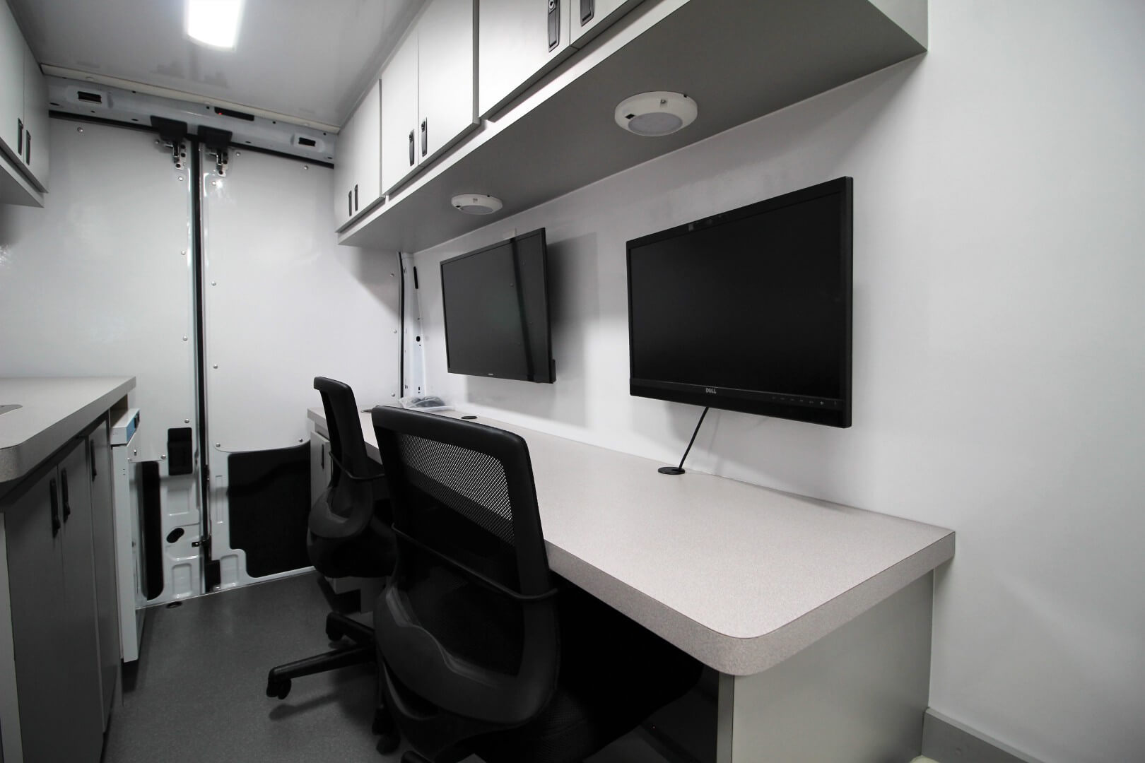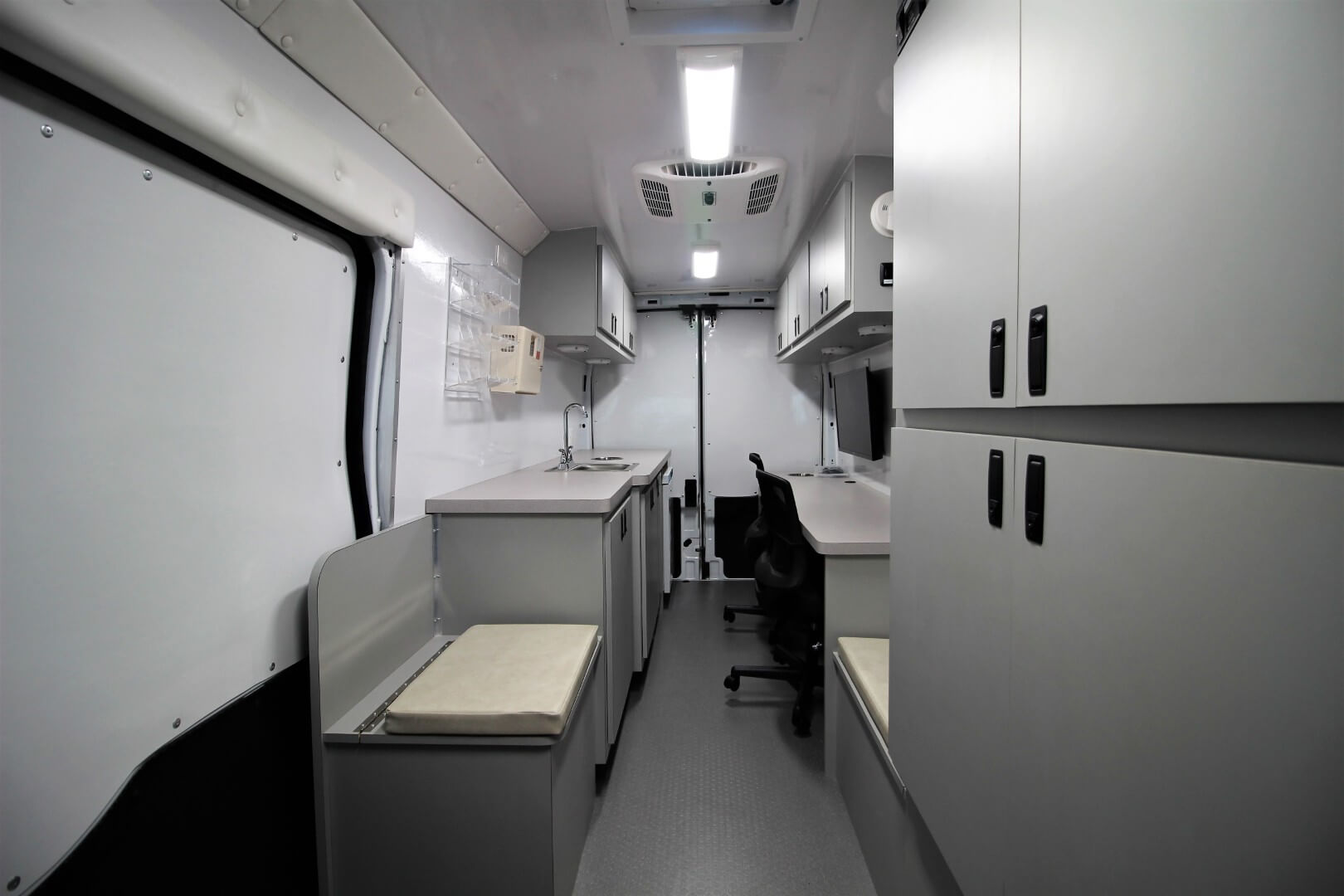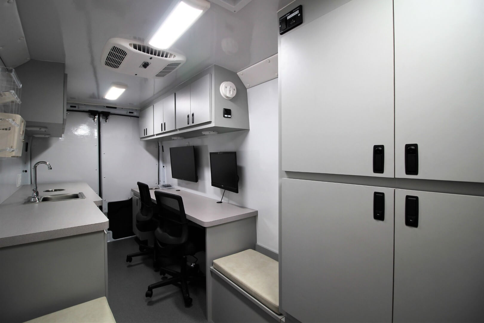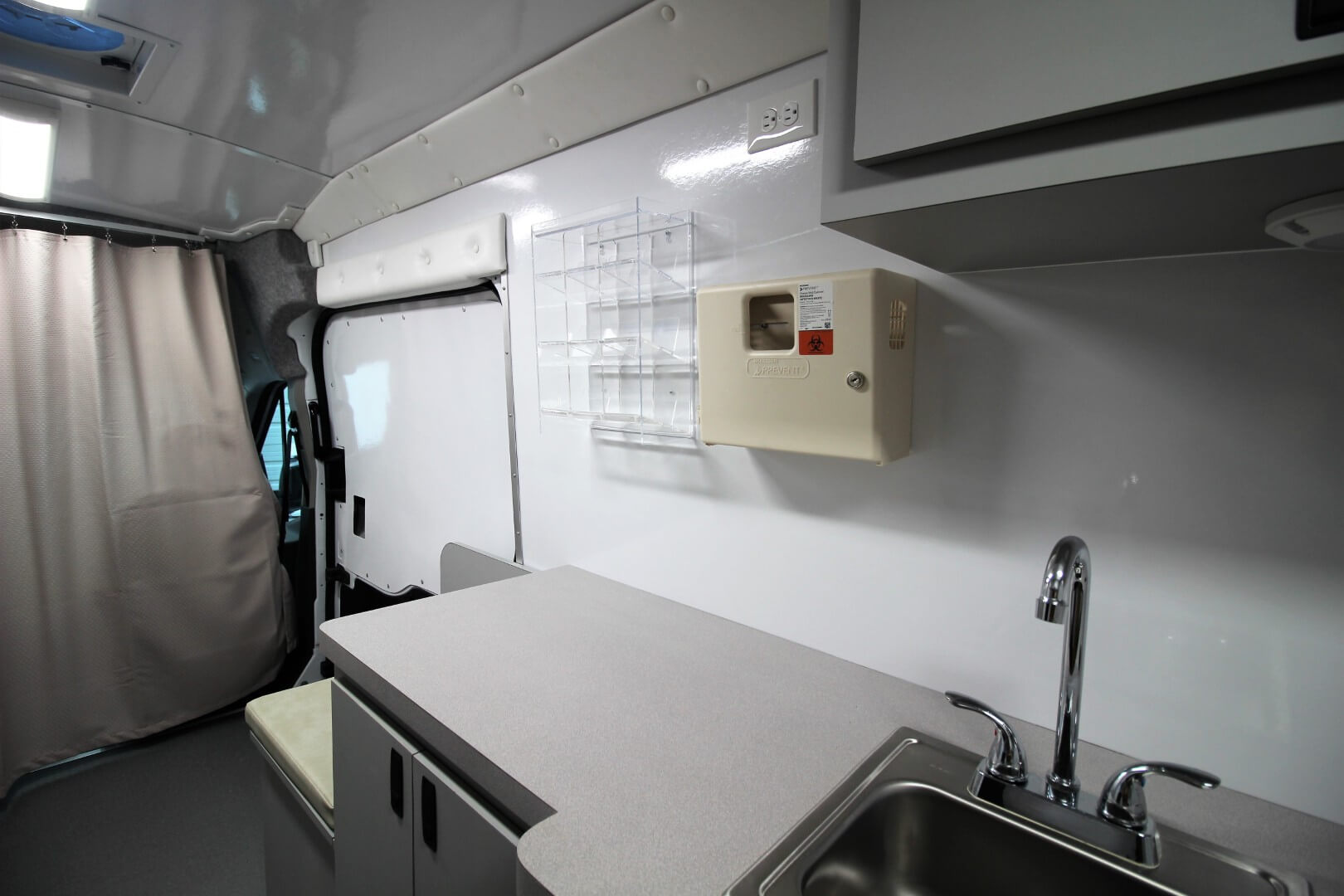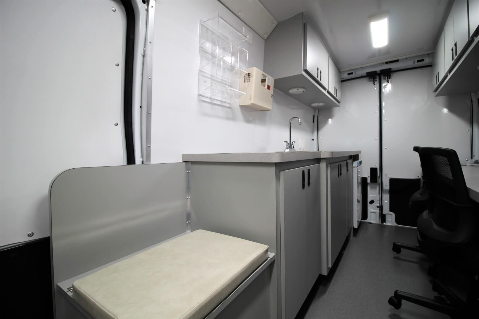 Immediately inside, a lockable overhead cabinet provides secure storage for paperwork, supplies, and medical equipment.