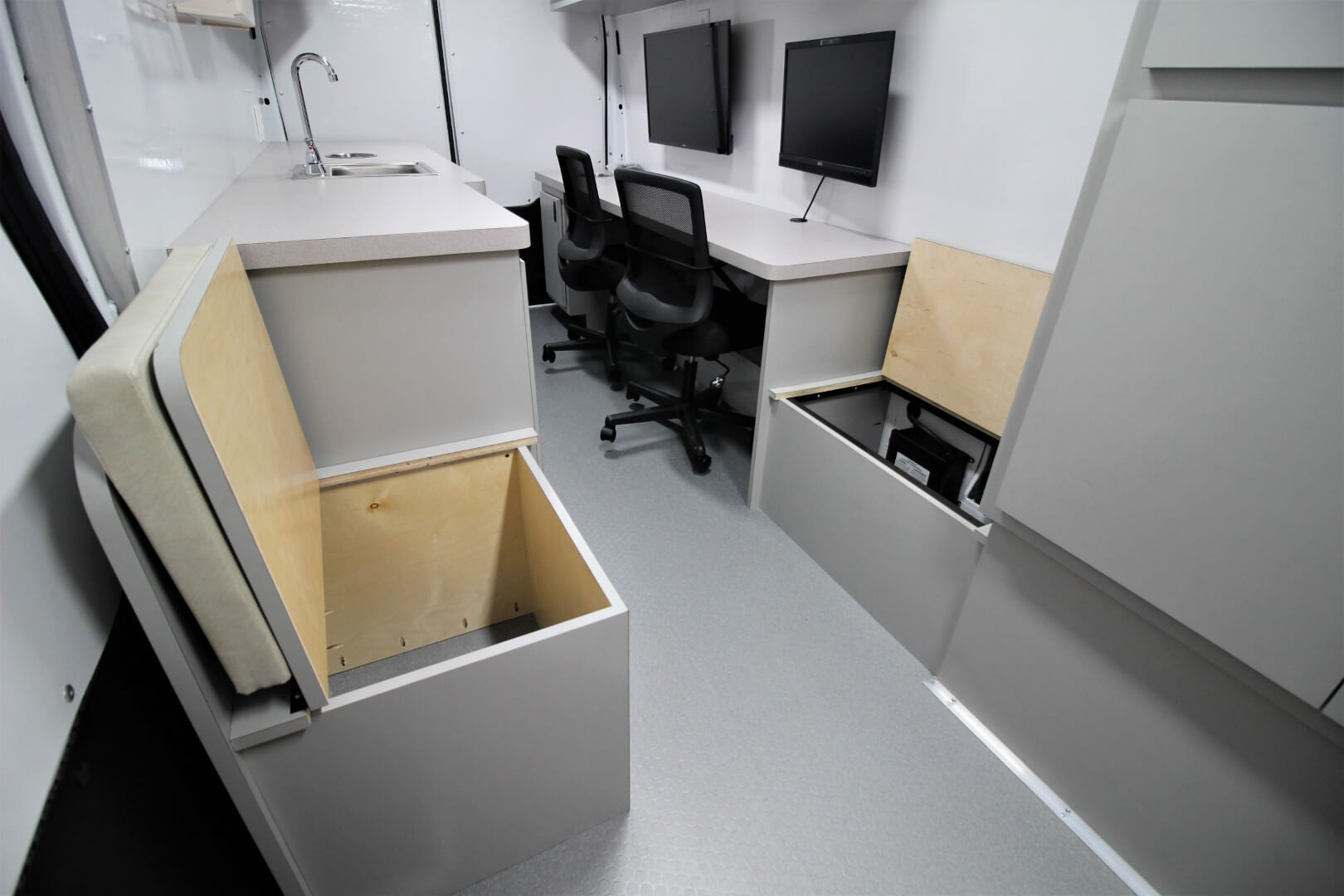 Further back on the driver’s side is a dual‑position counter workstation equipped with: