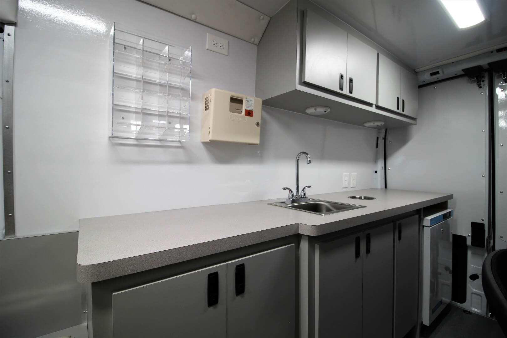 A sink is integrated into the counter to maintain sterility and comply with mobile clinical hygiene standards.