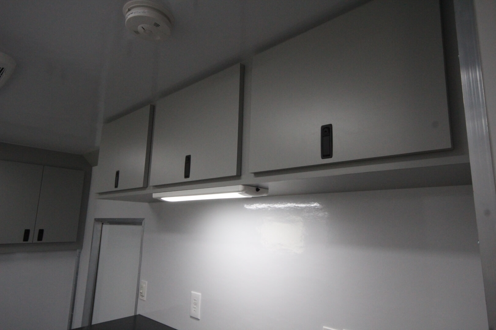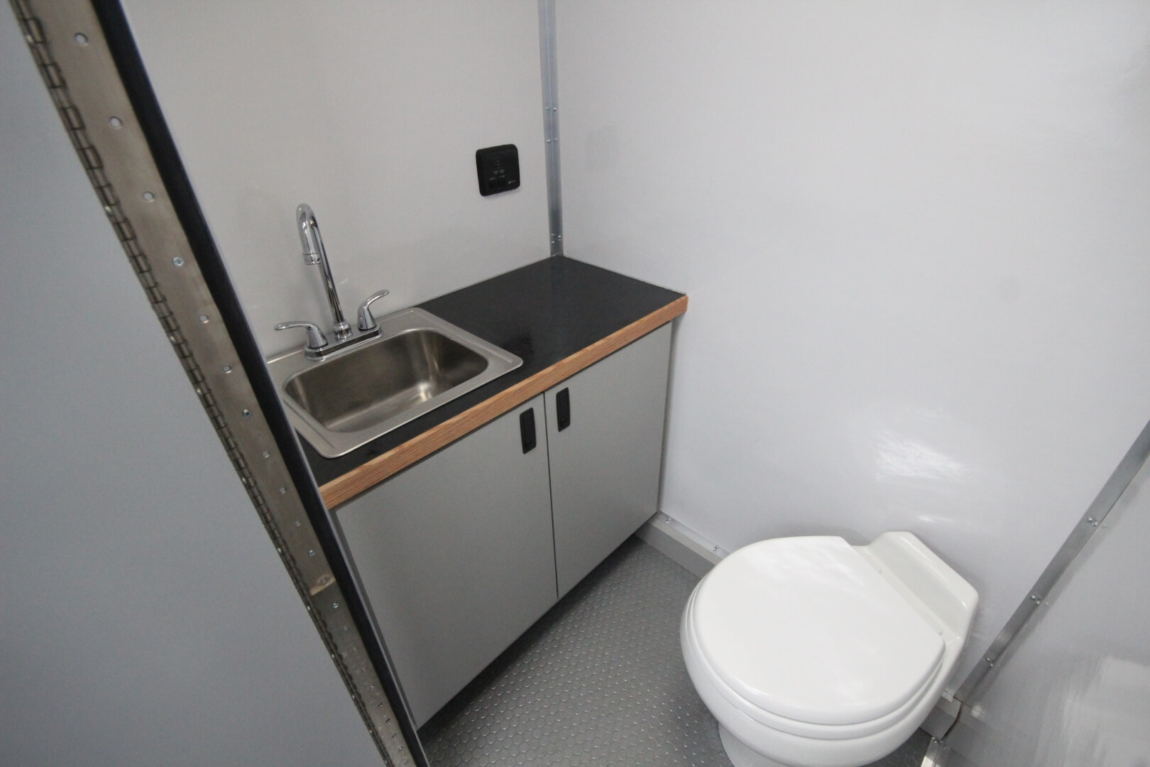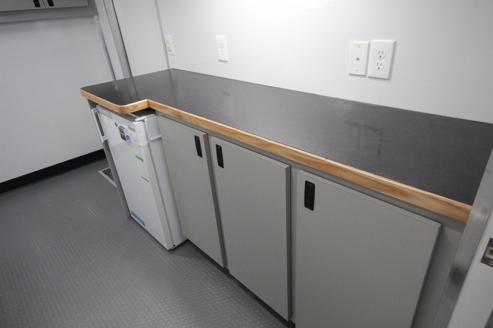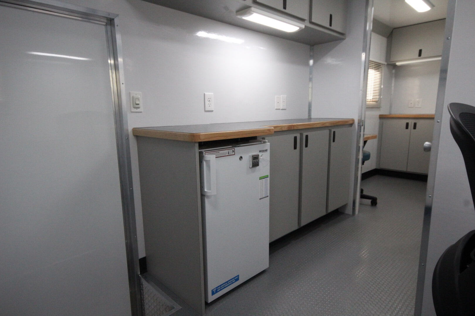 This mobile medical clinic was built in a 17′ box with a 36″ attic for additional storage and to provide an out-of-the-way space for the electrical cabinet. This layout included an intake room, a bathroom, and a rear exam room that can comfortably accommodate one patient.
