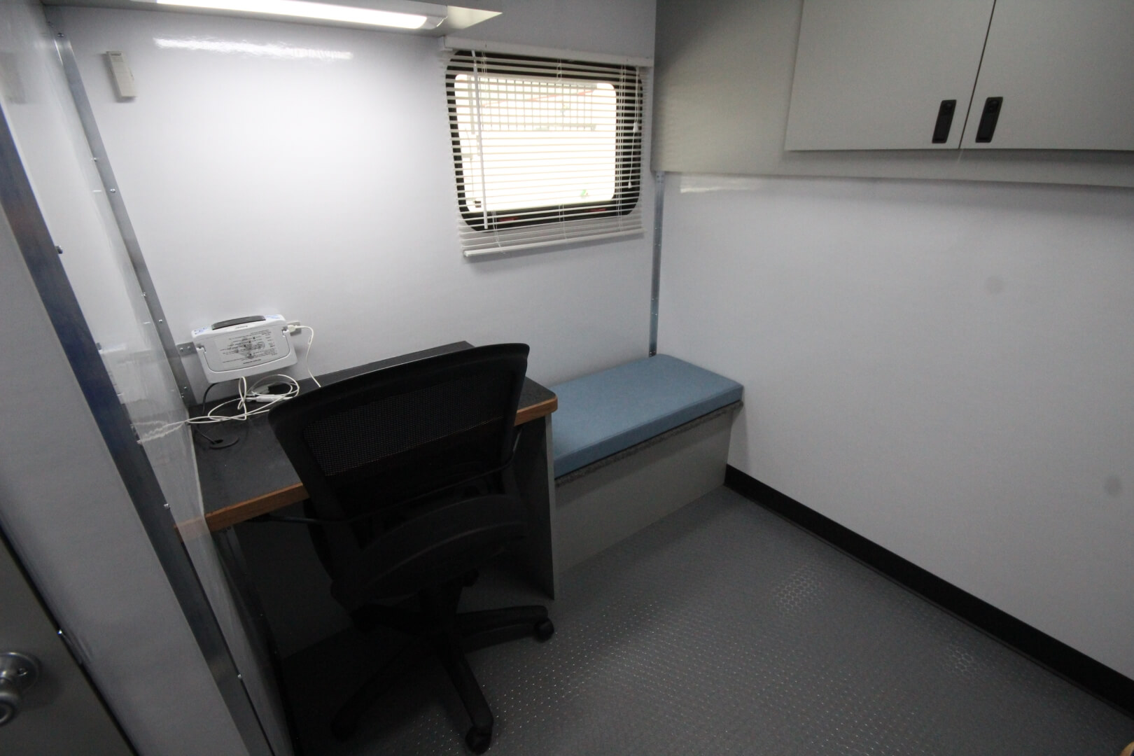 Intake room with a workstation, blood pressure monitor, bench seating, medical-grade refrigerator/freezer, overhead cabinets
