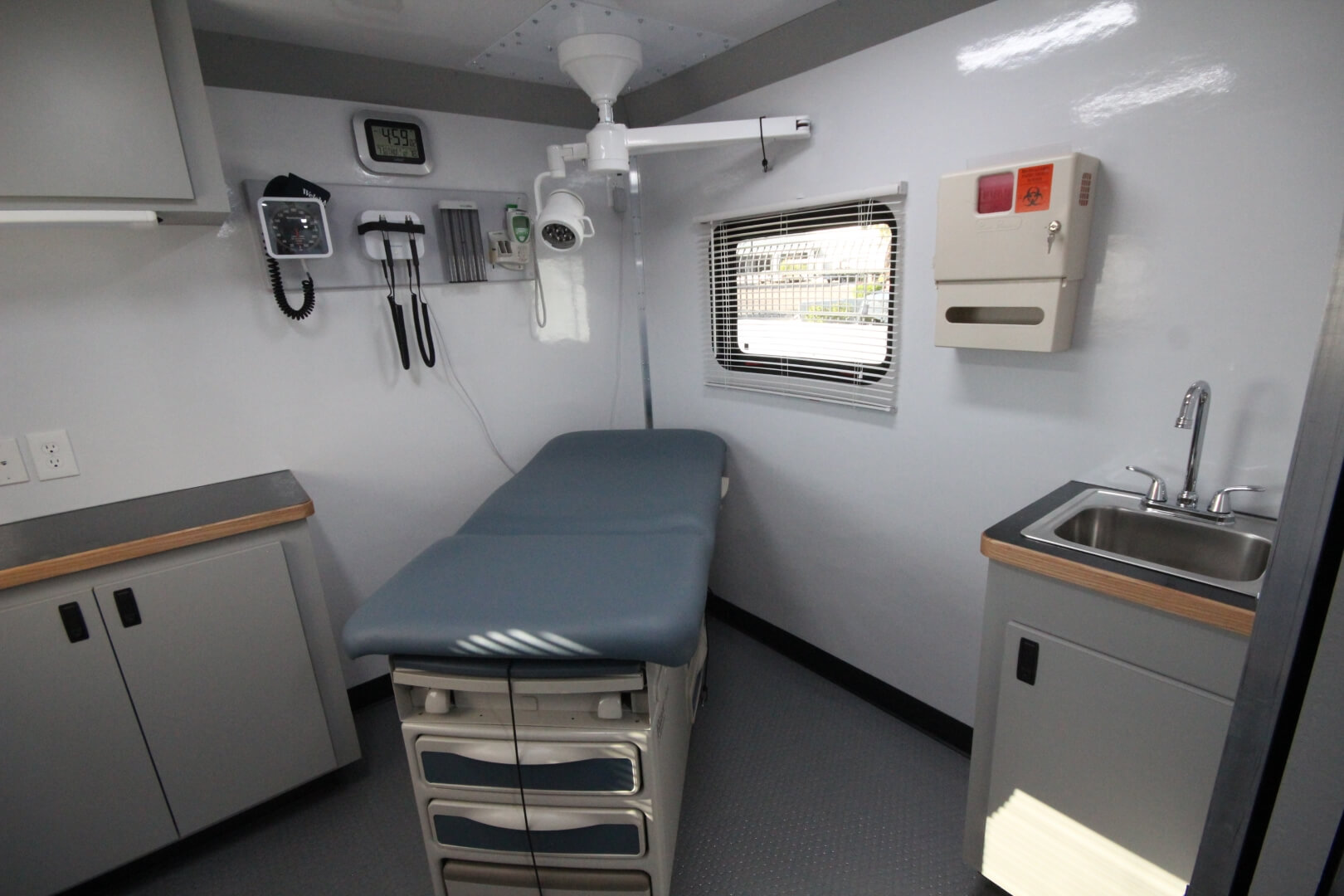 The rear exam room of this mobile medical vehicle is separated from the intake room by a pocket door, providing privacy. This room contains a Midmark Ritter examination table, Welch Allyn diagnostic board, ceiling-mounted mobile surgical light, sharps disposal container, handwashing sink, counter with a duplex, Cat6 outlet, and a small ledge with a stool.
